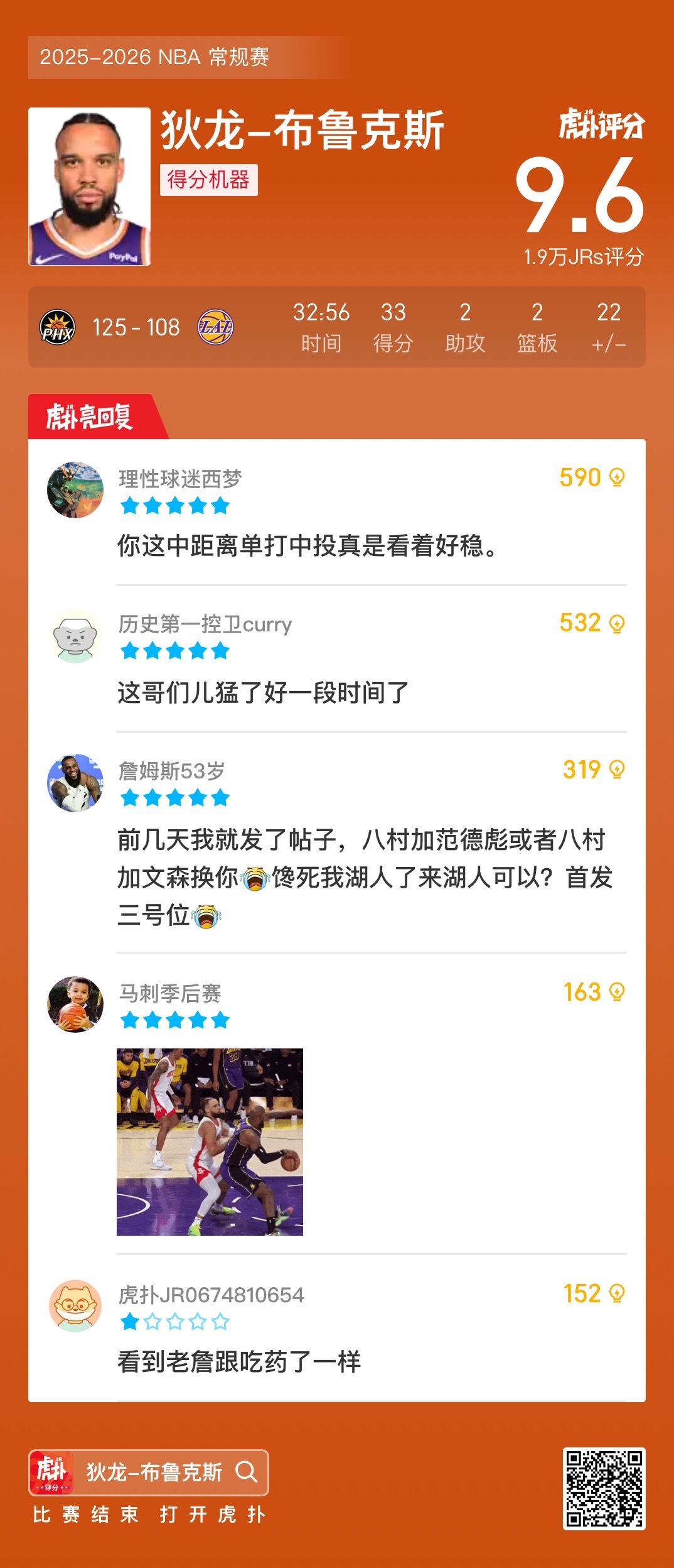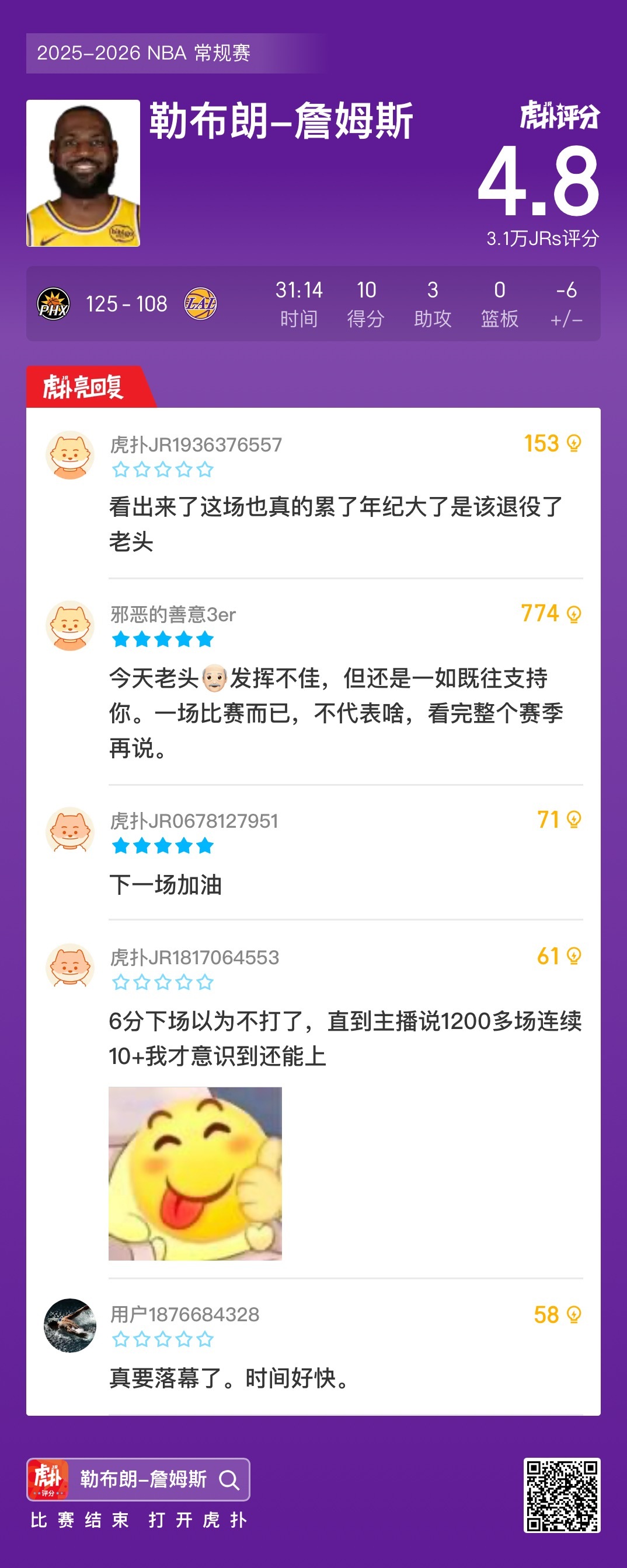 詹姆斯仅得10分,湖人7连胜被终结,接下来将迎来东部三连客今天NBA常规赛湖人主场迎战太阳的比赛已经结束。全场战罢,湖人以108-125不敌太阳。此役后,湖人7连胜被终结,目前15胜5负位列西部第二。湖人未来将迎来三连客场,分别对阵猛龙(14胜7负)、凯尔特人(11胜9负)、76人(10胜9负)。三连客结束后,将在主场迎来NBA杯淘汰赛,对阵马刺。詹姆斯延续得分上双纪录太阳vs湖人布克受伤