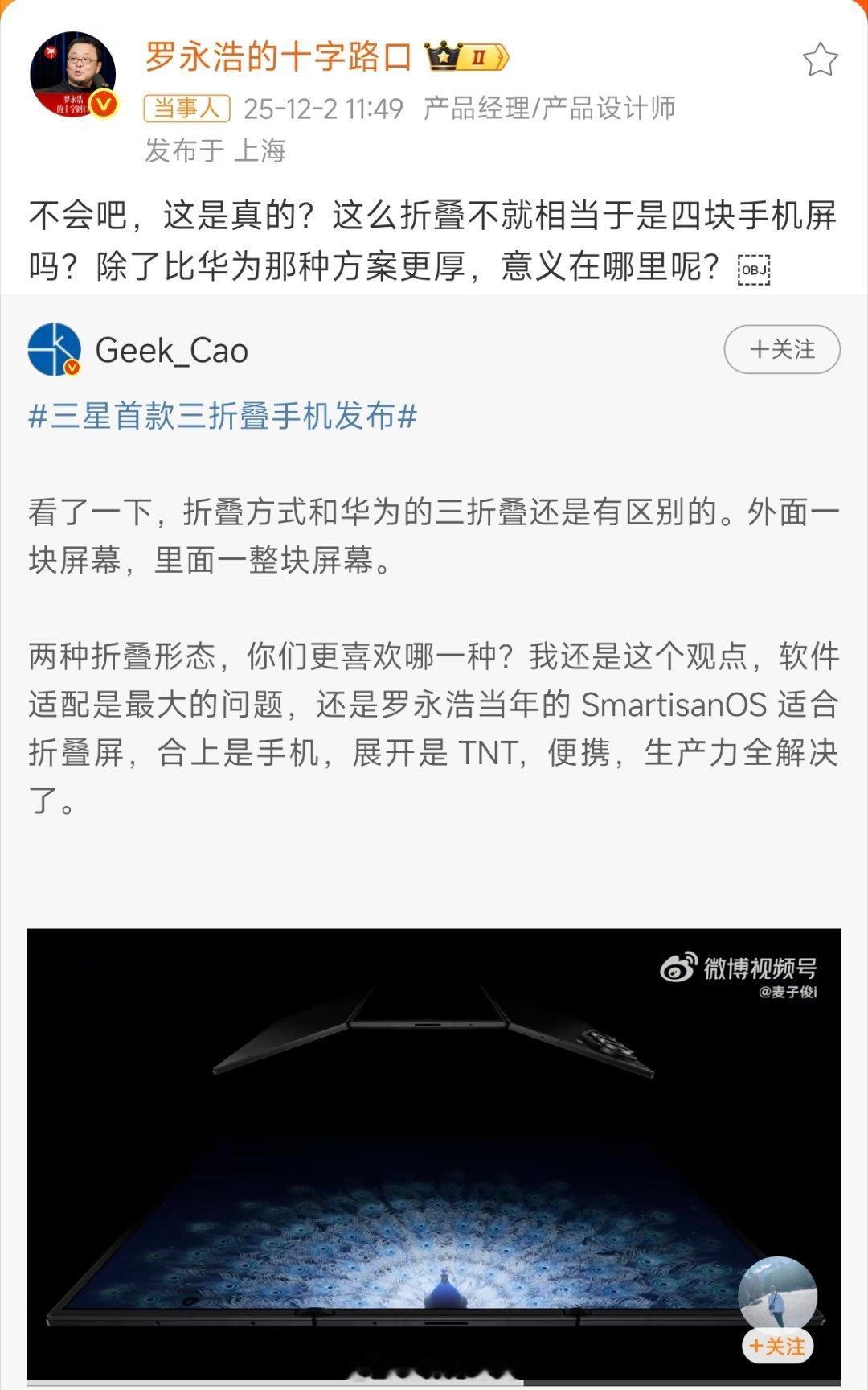罗永浩谈三星三折叠老罗对三星三折叠的看法其实挺有道理的。他主要担心的是厚度问题,