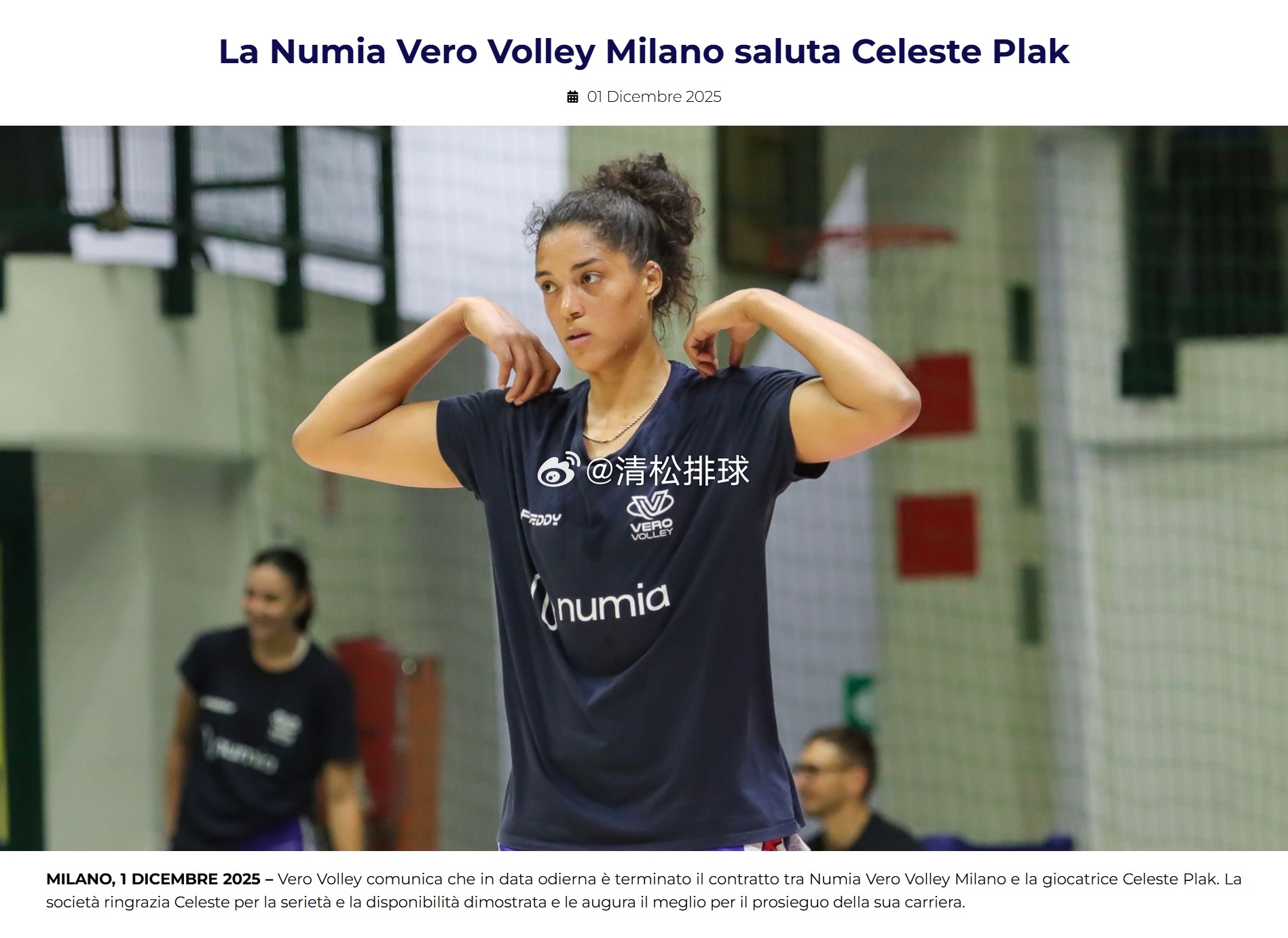意大利米兰女排俱乐部官方宣布与荷兰女排接应普拉克解除合同。清松带你看排球2025-2026意大利女排甲级联赛