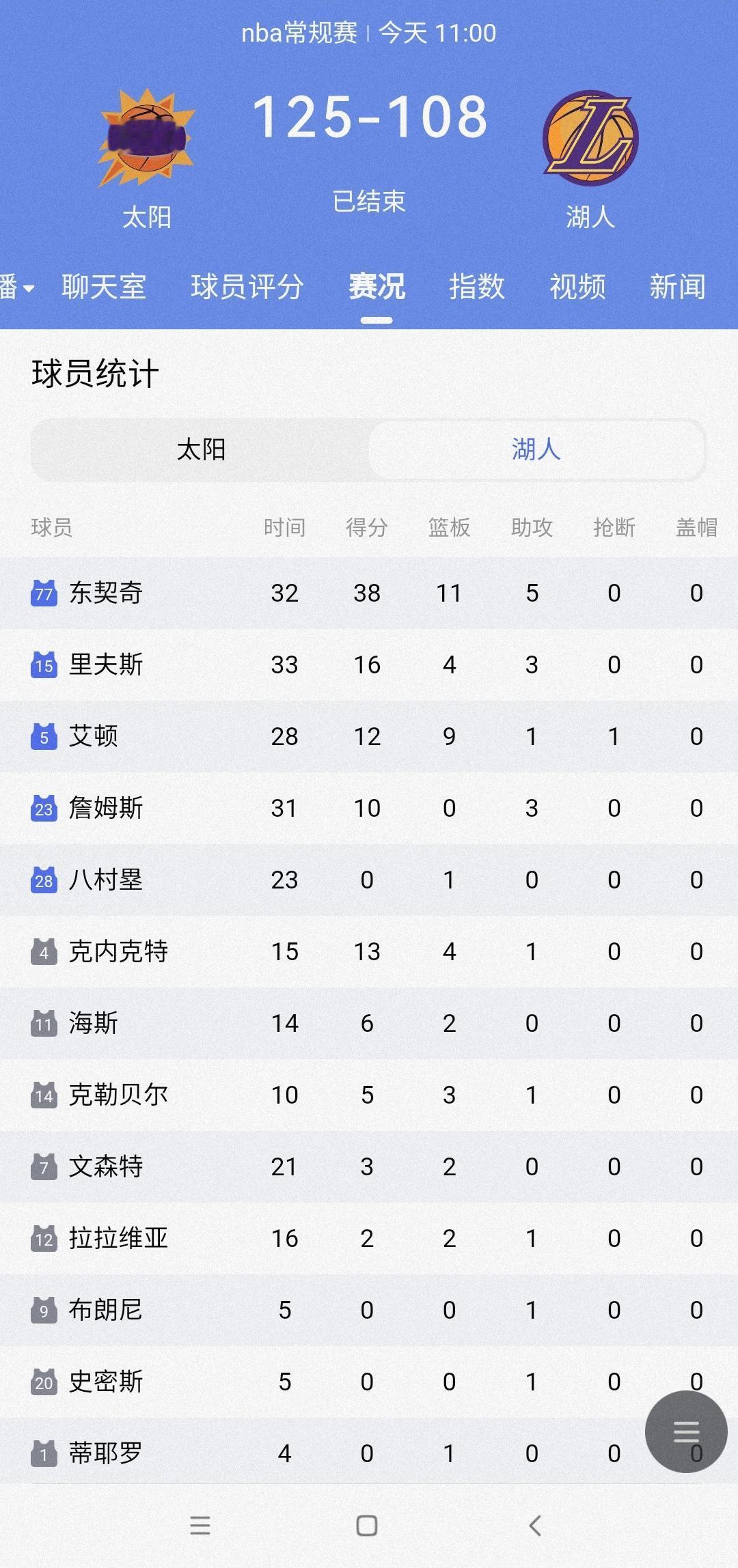 老詹31分钟只得10分!湖人这场输得真是没脾气! 12月2日常规赛,湖人108 - 125惨败给太阳。詹姆斯这场状态差到离谱,出场31分钟,10投才3中,三分4中1,罚球4中3,就拿了10分,还有3次助攻和3次失误,正负值 - 6。Skip赛后都吐槽他表现平平。 再看看其他人,东契奇上场31分钟,出手26次拿38分,但失误9次,正负值 - 25;里夫斯上场33分钟,12投得16分,失误5次,正负值 - 11。其他像八村塁、文森特正负值也全是负的。这场比赛湖人全员低迷,输球一点不冤。 湖人 nba 湖人