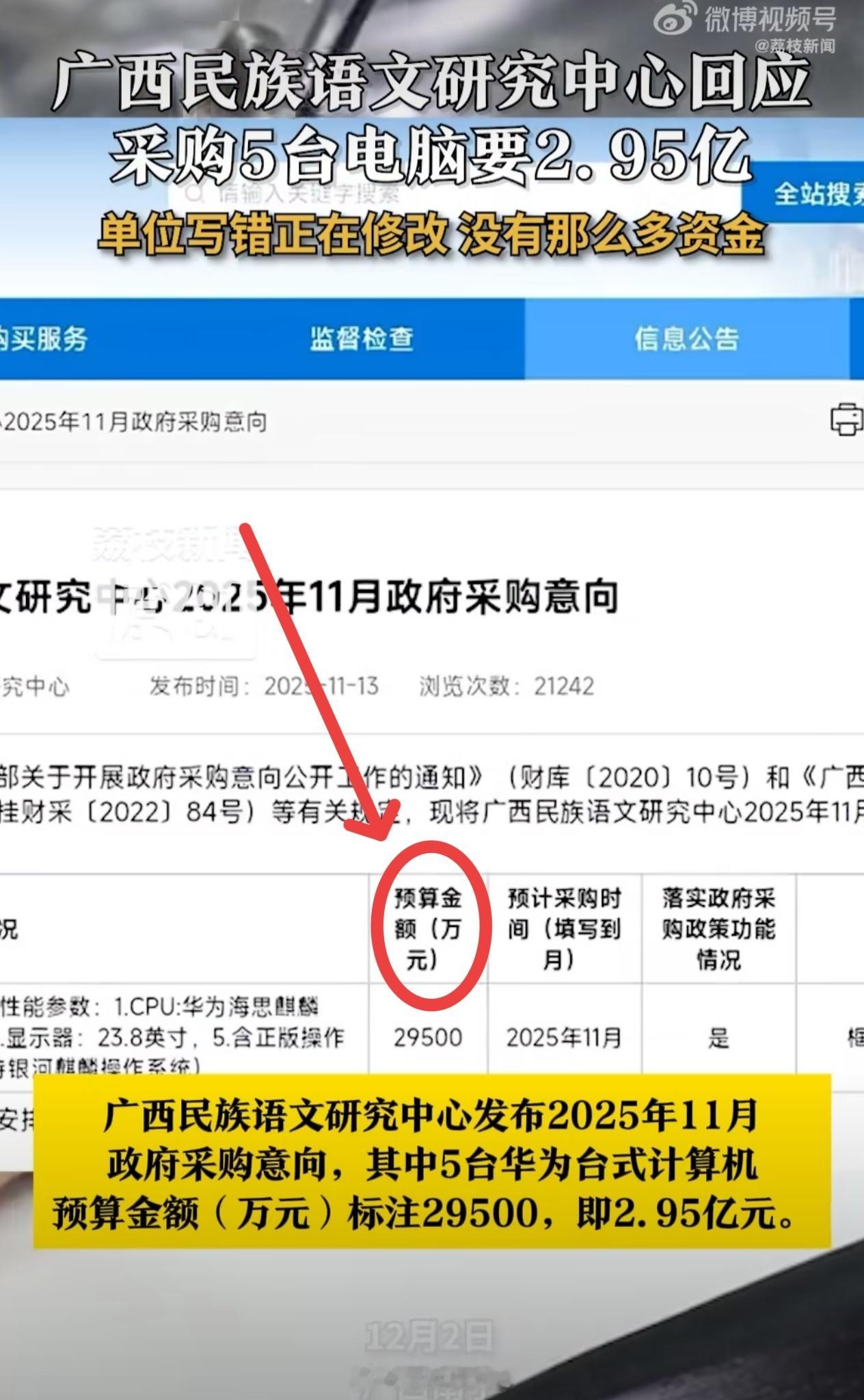 机构采购5台电脑预算写2.95亿我寻思得多高的配置?哦,原来只是工作人员疏忽了