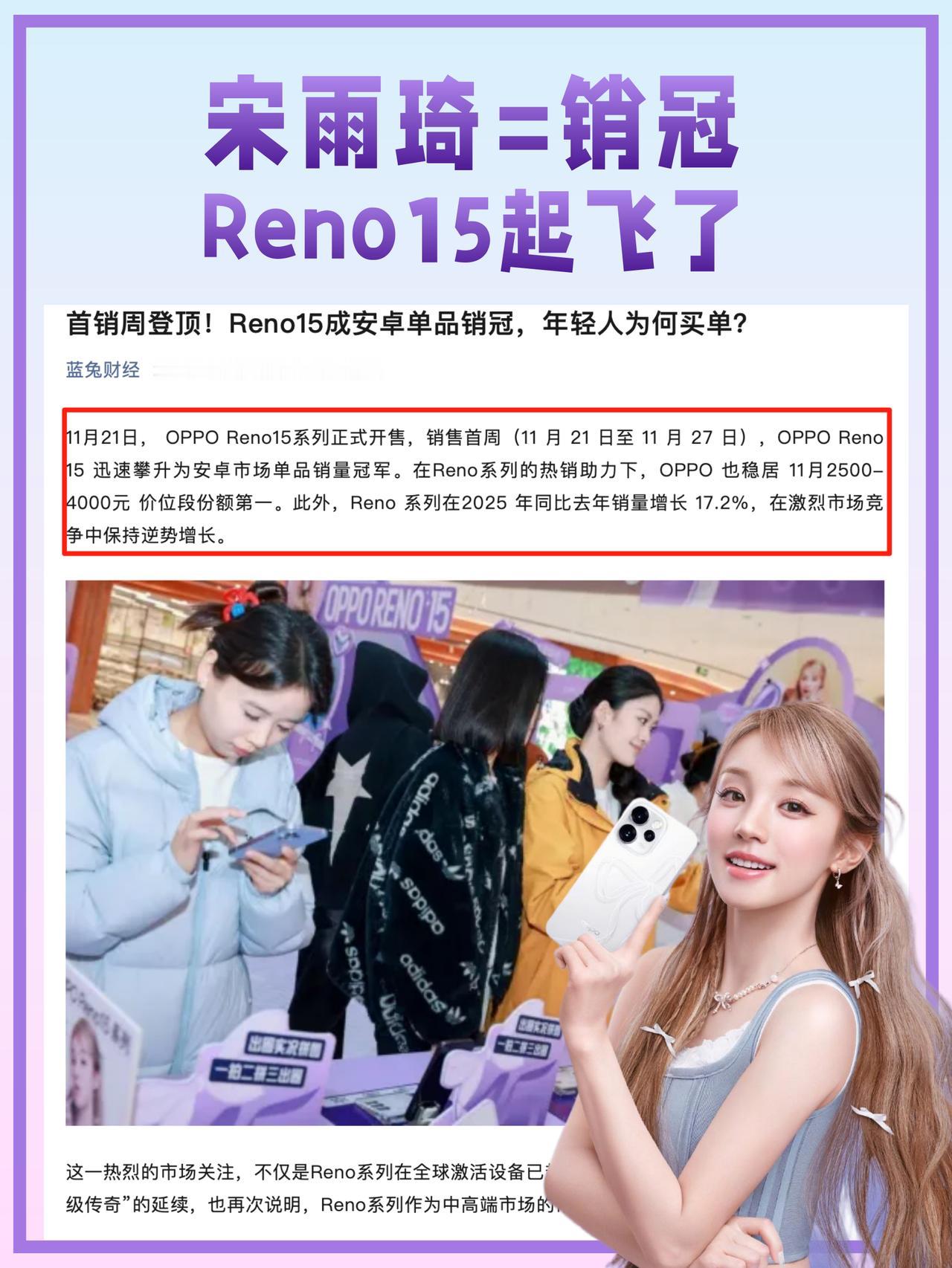 宋雨琦同款手机的含金量具象化了!! 宋雨琦简直是销冠啊,又助力Reno15大卖了🔥真没想到能这么夸张! 看了下蓝兔财经的信息,👇开售首周(11.21—11.27),这手机直接稳居安卓手机市场单品销冠🏆, 而且还带飞OPPO拿下11月2500-4000元价位段份额di一。 别说这代Reno15整体升级力度也很大! 外观质感很对年轻人审美胃口✨ 没有凑数镜头📸后置2亿像素主摄, 还有5000万像素潜望长焦(部分同级产品没有长焦镜头)、出圈实况拼图功能、4K实况一拍多出、CCD闪光实况等, 比iPhone的玩法还多,这不妥妥live神器? ColorOS系统也好用!AI取餐码、AI记账、AI实景对话都很实用,而且还是🍎搭子,可以和🍎手表耳机等互联! 当然啦,“宋雨琦同款”这一title就能吸引很多人买单了 宋雨琦 宋雨琦同款 OPPOReno15 数码资讯 手机热销 颜值手机 Live神器