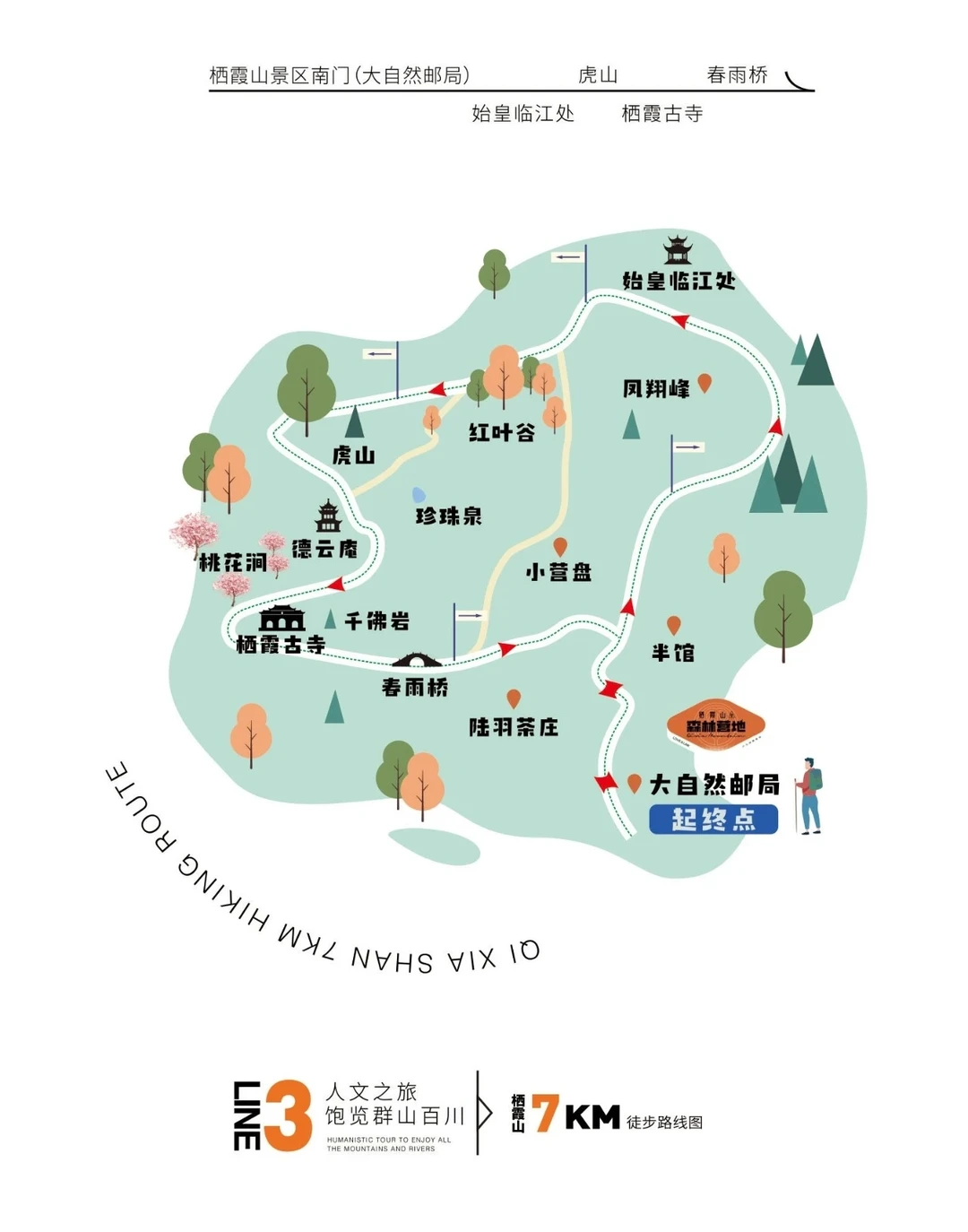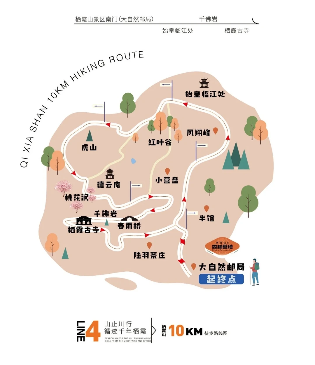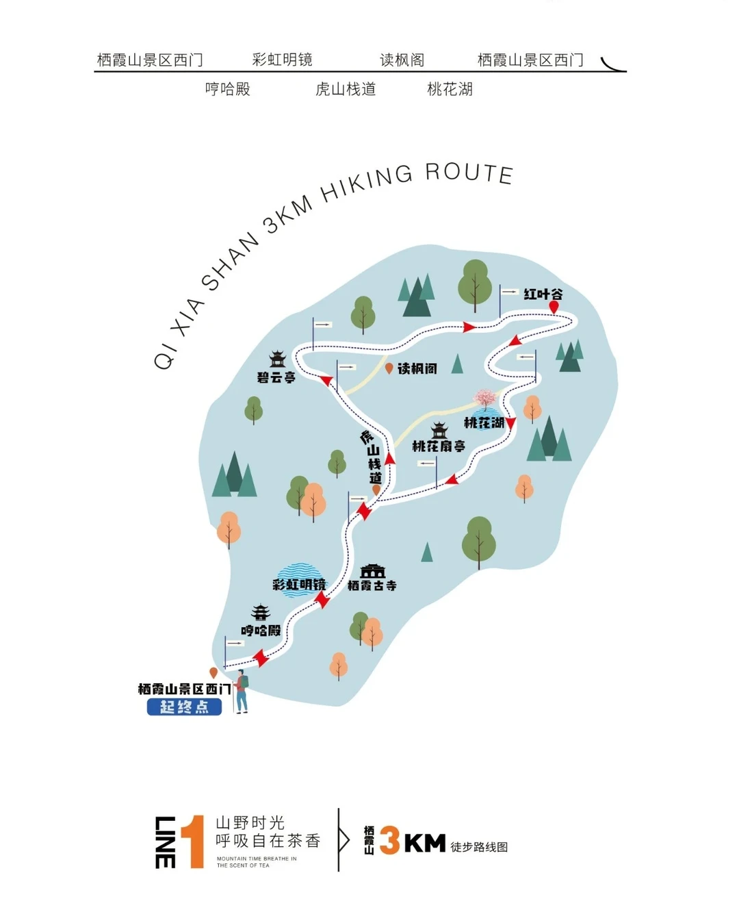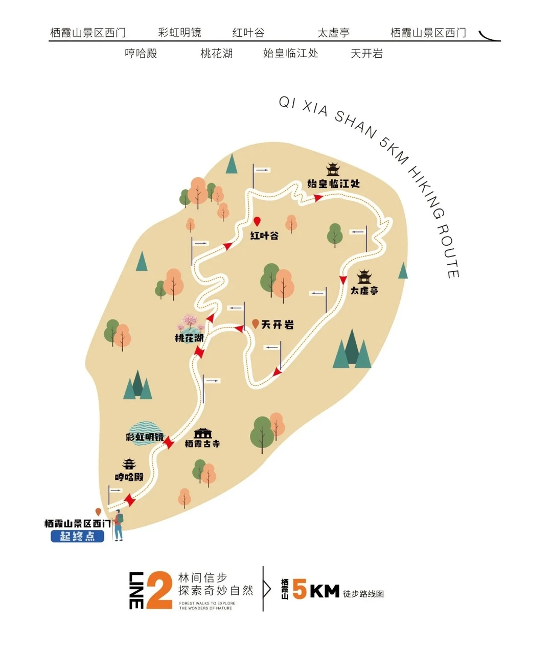 🔥西门(⭐梧桐)→明镜湖→栖霞寺(⭐银杏)→千佛岩→舍利塔→小营盘→了凡问道→枫林湖→太虚亭→凤翔峰→始皇临江处(⭐长江)→红叶谷→虎山→读枫阁→碧云亭→桃花湖→西门