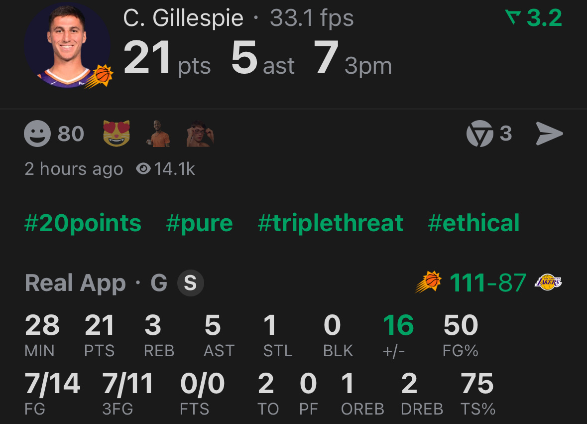 吉莱斯皮最近8场已经投中了35记三分,68中35。太阳vs湖人