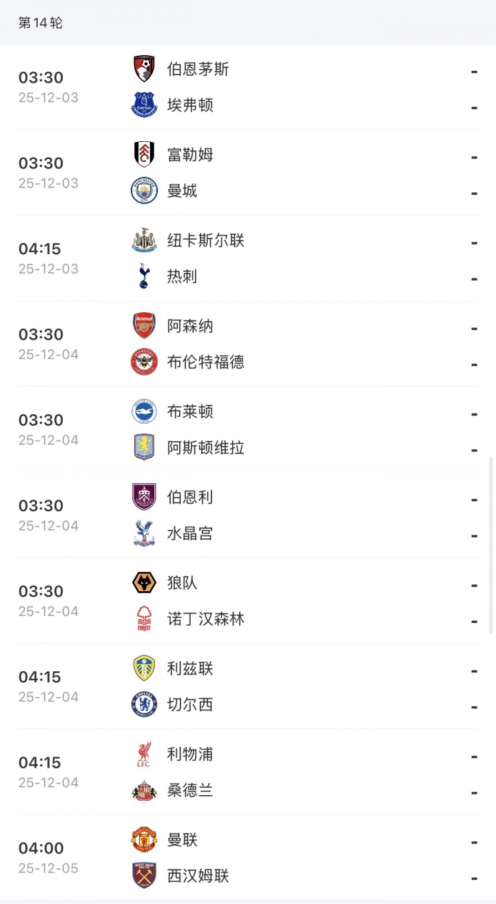 伯恩茅斯2-2埃弗顿 富勒姆1-2曼城 纽卡素1-1热刺 阿森纳4-1布伦特福德 布菜顿1-0维拉 伯恩利1-3水晶宫 狼队1-1森林 利兹联0-2切尔西 利物浦2-1桑德兰 曼联2-0西汉姆联