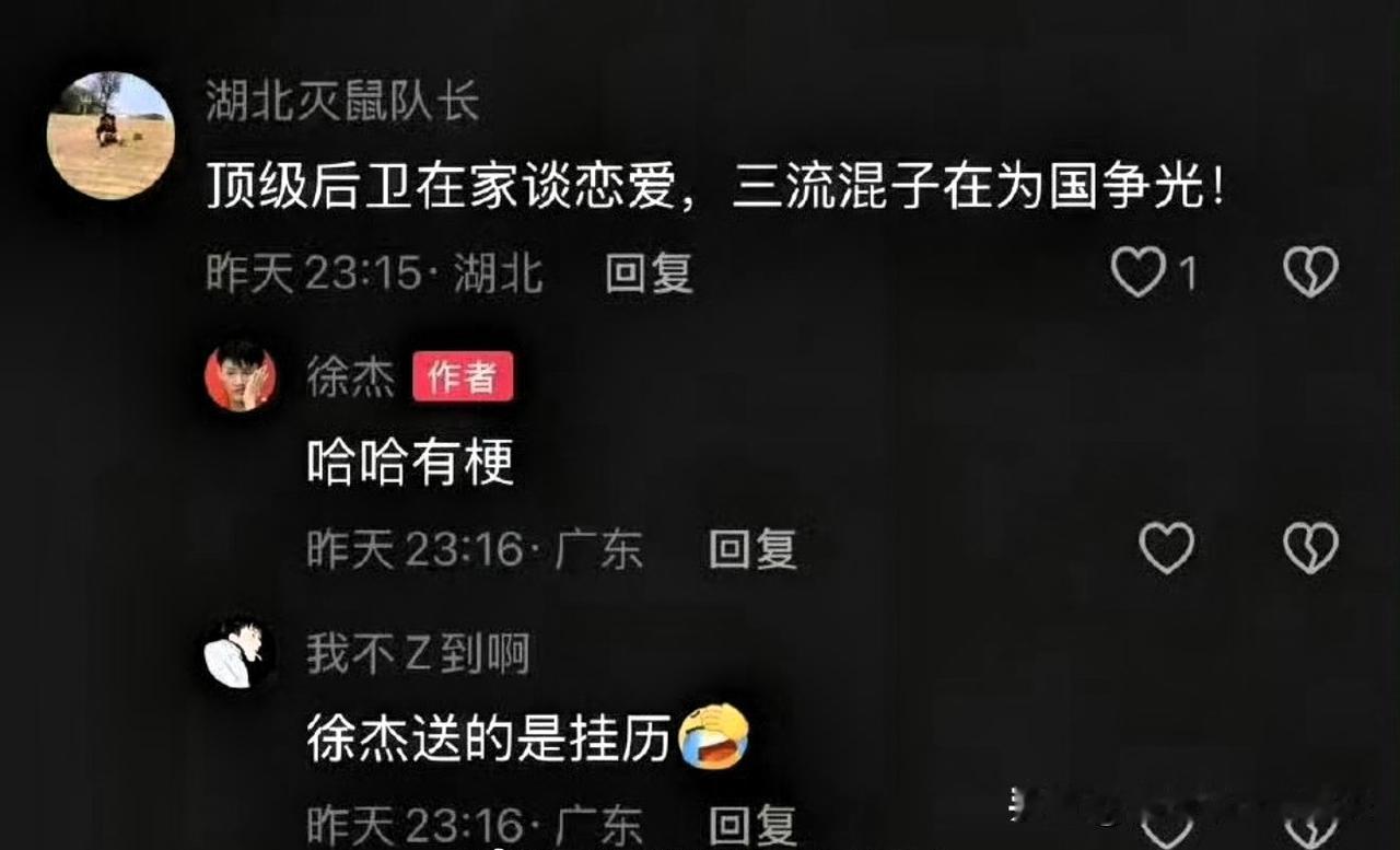 徐杰心情大好!球迷称他是顶级后卫,没有去打世预赛和韩国比赛,在家谈恋爱,三流后卫为国征战!徐杰得意回答:哈哈,有梗!这是什么意思,谁是三流后卫,胡明轩+高诗岩+廖三宁+王岚嵚+,辐射面挺广,球迷说话不经过大脑,徐杰多余回复他,话说,没打比赛的球员就是最好的球员吗,也未必,比如说林葳,作为cba本土得分王,近日,他在ncaa教练公开批评他不听教练安排,胡乱出手,假如林葳去打韩国表现也未必出彩吧,所以徐杰没必要参与敏感时期话题