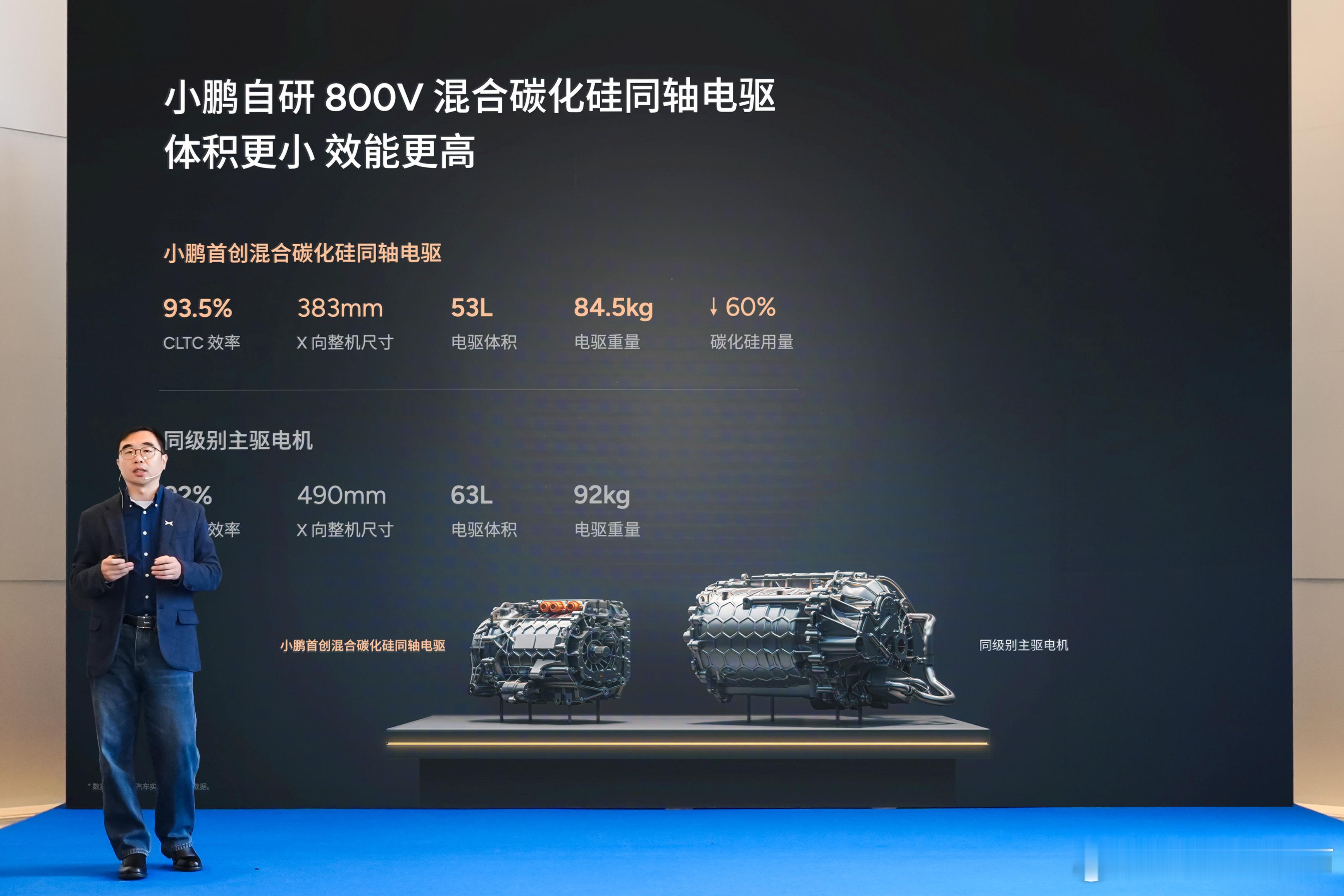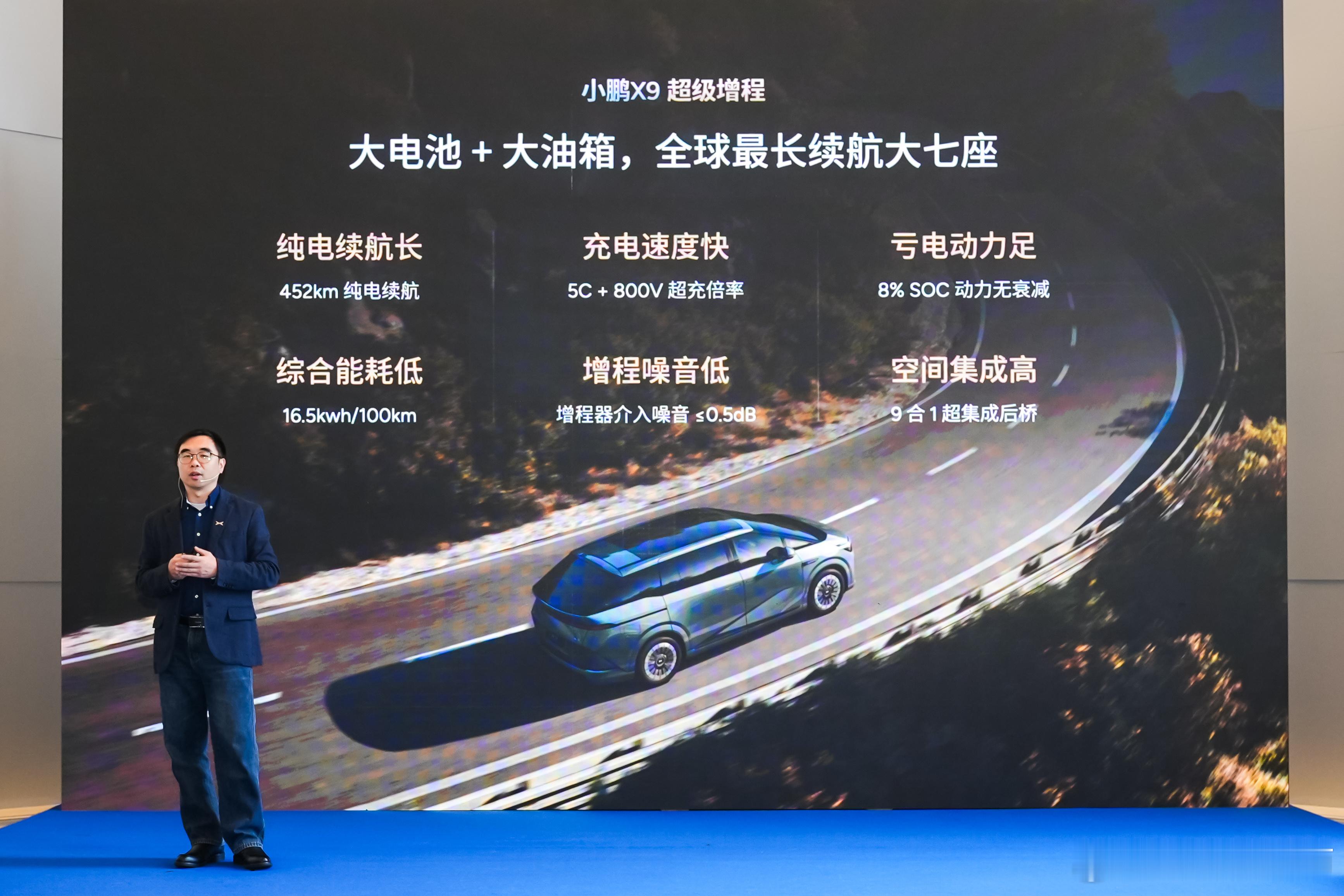 图一是目前小鹏 X9 超级增程的优势项目,要实现这样的能力,在初期研发的时候有些问题还无法解决,而今天华为和小鹏的发布会上介绍了这几个技术解决方案,以下转贴一下这些对应方案介绍:挑战一:极致前舱布置,不侵占车内乘坐空间- 发电机&电控一体化设计,Y向尺寸小于等于230mm。- 前舱一体压铸技术:零部件82合一,总内空X向长度提升23mm;挑战二:极致能量管理,大七座也能实现1602km超长续航- 超级增程大电池+大油箱方案:63.3kWh超快充磷酸铁锂大电池+60L大油箱满足各种能量模式需求。- 高效率发电机:发电效率大于等于92%,燃油发电效率3.6kWh/L,领先行业9%。- 小鹏自研高压纯电架构:搭载小鹏自研高压纯电架构,实现百公里16.5kWh CLTC同级超低电耗。- 小鹏自研超级增程模式:智能用油用电,联动VLM大模型,学习车主驾驶习惯,智能补能,低负载场景智能用电,降低油耗;高负载场景智能发电,提升动力。做到百公里2.53L同级最低油电折算综合油耗。挑战三:能源输出体系可满足大七座全场景使用- 搭载高效率发电机,75kW持续发电功率,150km/h巡航不亏电。- 拥有小鹏自研800V混合碳化硅同轴电驱,体积更小,X向整机尺寸383mm,电驱体积53L;效能更高,CLTC效率93.5%。还能智能切换功率模式:高效模式、重载模式、轻载模式,无论是爬坡、拖载,还是低速跟车,在任何场景下都能释放最优性能,做到SOC 8%动力依旧不衰减。挑战四:无感增程,增程器介入噪音小于等于0.5dB- 主动停缸功能联调,增程器启停震动总值减少60%,实现无感启停。- 增程器结构深度优化,单体噪声降低10%,关键点震动噪音减少30%。- ENC增程器主动降噪,加速轰鸣音突出峰值最大降低7dB(A)。通过大电池+超快充,小鹏X9超级增程实现超90%用车场景都是静谧无感的纯电体验。小鹏X9联手华为推出下一代增程发电机