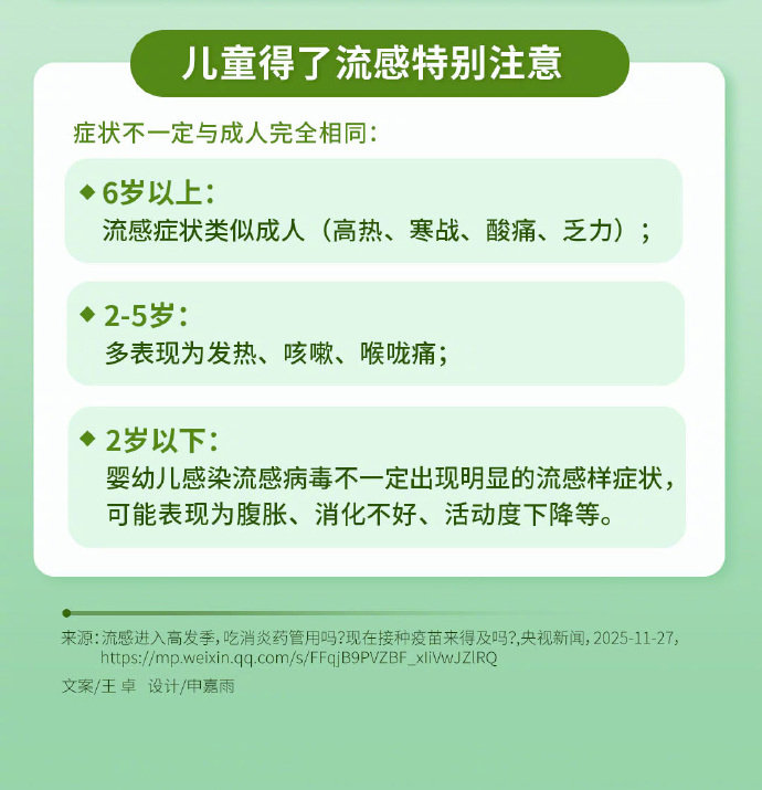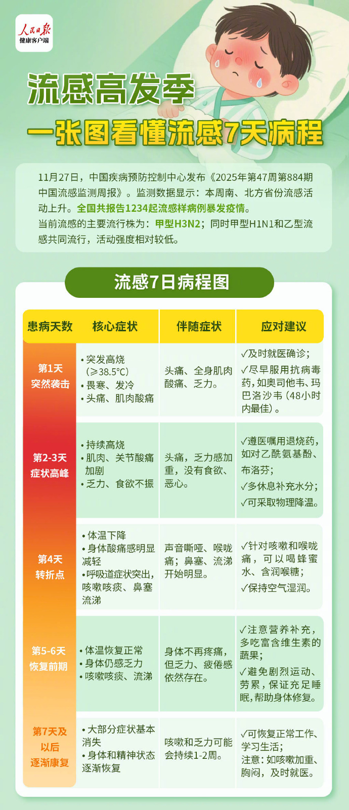 【#感染流感1周内症状#】流感来势汹汹,表现为突发高热,伴有全身乏力、肌痛等不适。11月27日,中国疾控中心发布的《2025年第47周第884期中国流感监测周报》显示,本周南北方省份流感活动上升,全国共报告1234起流感样病例暴发疫情,当前主要流行株为甲型H3N2,甲型H1N1和乙型流感也在共同流行,活动强度相对较低。感染流感后一周内具体有什么症状?戳图↓↓(生命时报)