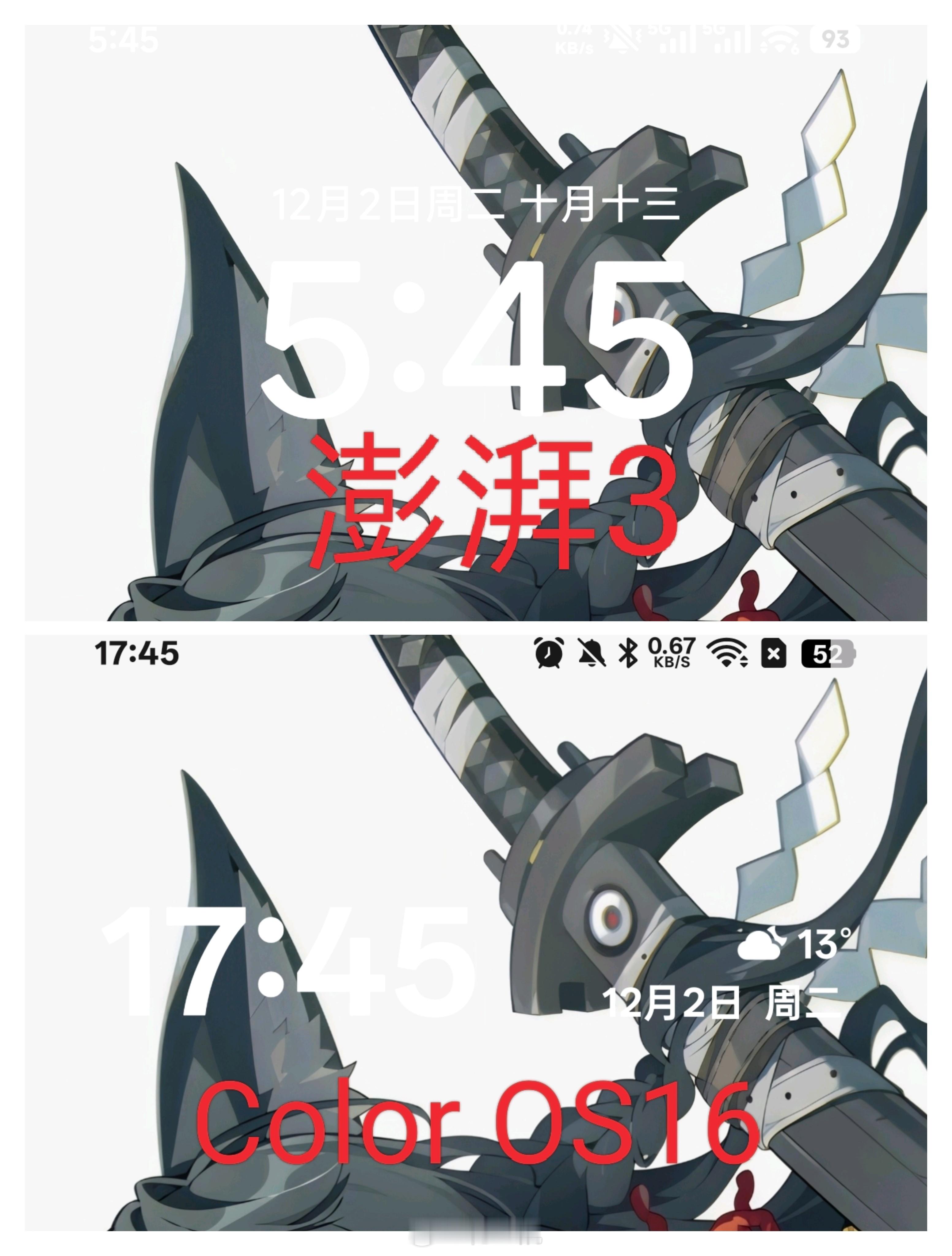 澎湃3的状态栏反色还有待进步,白色的背景下是白色的字,是真的看不清楚相同的壁纸,Color OS16就能做好反色,其他品牌也很少遇到这个问题