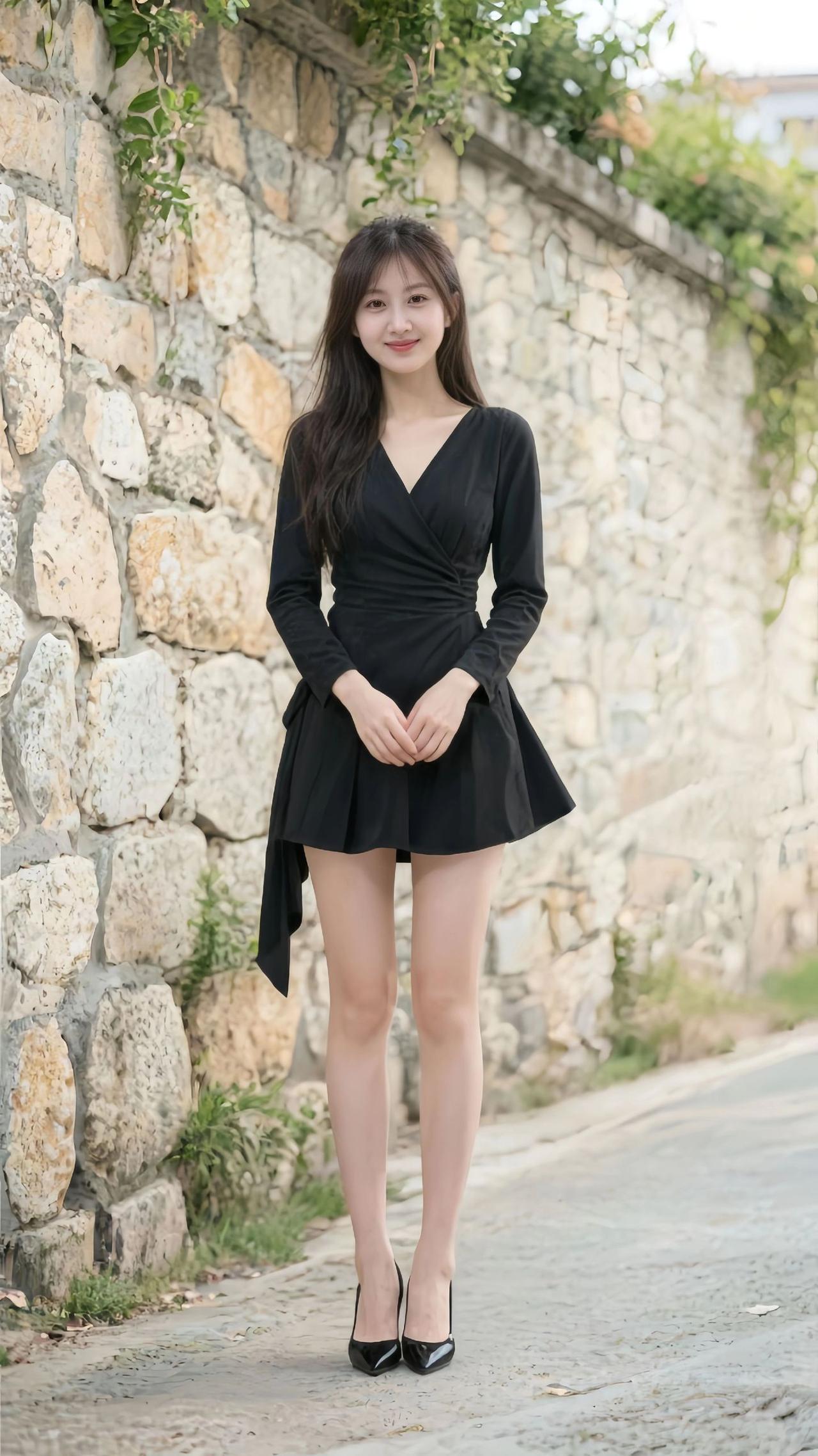 黑裙黑鞋,优雅气质,石墙背景,自然清新。