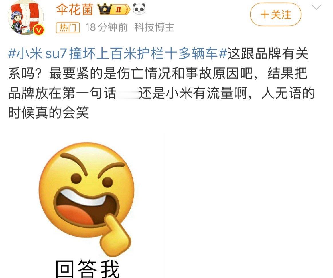 小米su7撞坏上百米护栏十多辆车小米就是以前的特斯拉吧,都把小米当流量密码了车主自己开车没注意,就关小米什么事了?正常的标题都是某小车撞上xxxx,大部分网友都忍不住了!