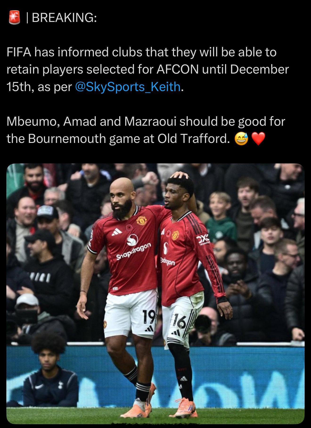 国际足联消息,俱乐部可以挽留预参加非洲杯的球员至12月15日。曼联有三个姆贝乌默 阿玛德和 马兹拉维可以在曼联对阵伯恩茅斯后再离队