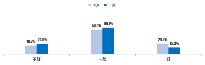 调查显示,认为11月经营状况“不好”的二手车经理人比例为24.0%,高于上月,经销商整体承压态势明显。