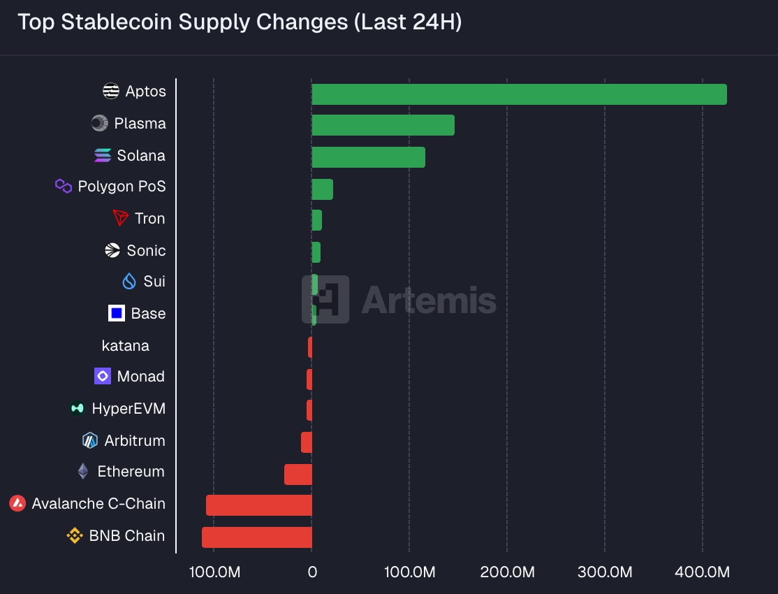 吴说获悉,据Artemis数据,Aptos在过去24小时内录得约4.27亿美元稳定币净流入,居所有公链首位,其次为Plasma(约1.47亿美元)和Solana(约1.17亿美元)。同期,以太坊、Arbitrum、BNBChain与AvalancheC-Chain则出现资金净流出。