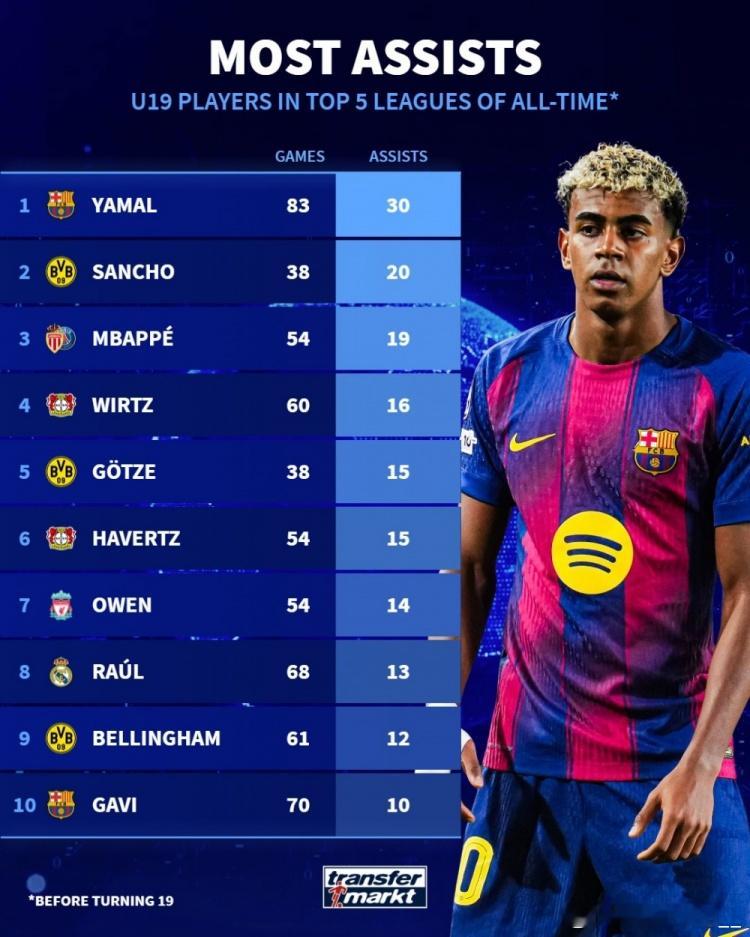五大联赛历史U19球员助攻排名(19岁之前助攻):亚马尔——83场30助桑乔——38场20助姆巴佩——54场19助维尔茨——60场16助格策——38场15助哈弗茨——54场15助欧文——54场14助劳尔——68场13助贝林厄姆——61场12助加维——70场10助五大联赛足球