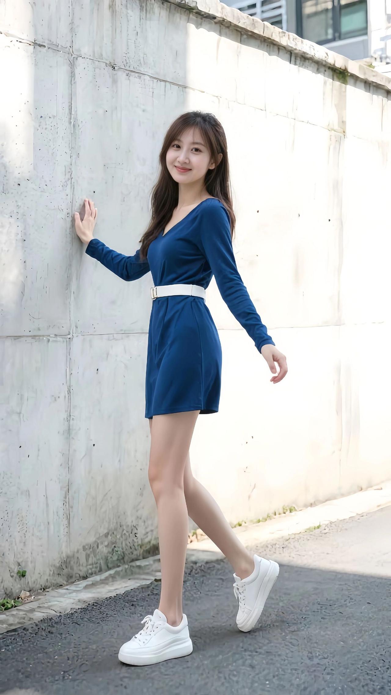 夏日清新穿搭,阳光洒在墙头的角落,时间仿佛静止在这一刻,蓝色连衣裙搭配白色运动鞋,十分轻松自在。