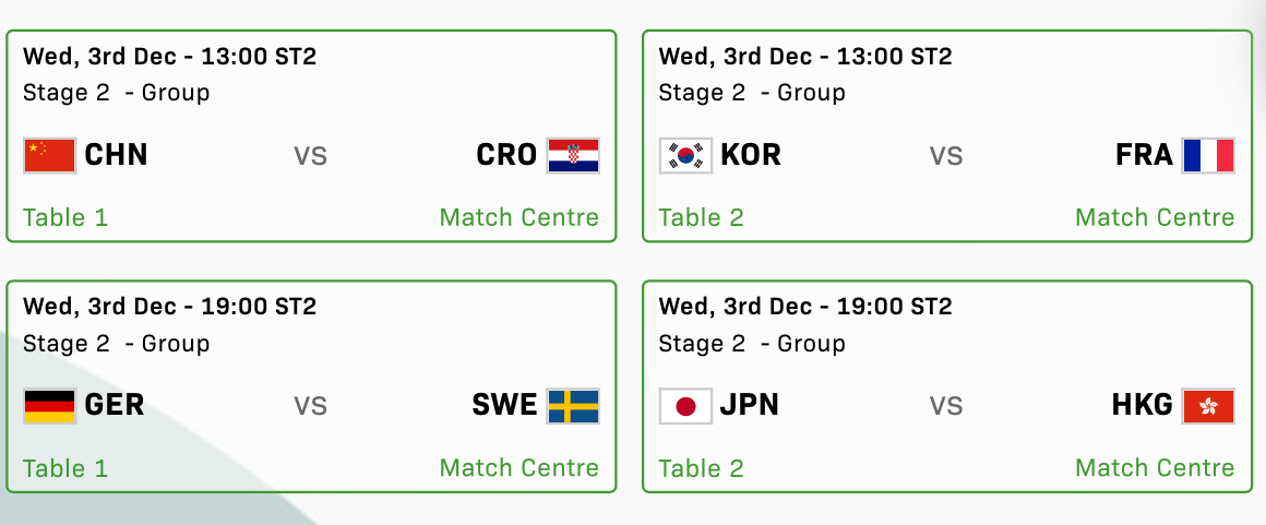 2025成都混合团体世界杯 12月3日赛程13:00 中国🇨🇳vs克罗地亚🇭🇷 1号台韩国🇰🇷vs法国🇫🇷 2号台19:00德国🇩🇪vs瑞典🇸🇪 1号台日本🇯🇵vs中国香港🇭🇰 2号台
