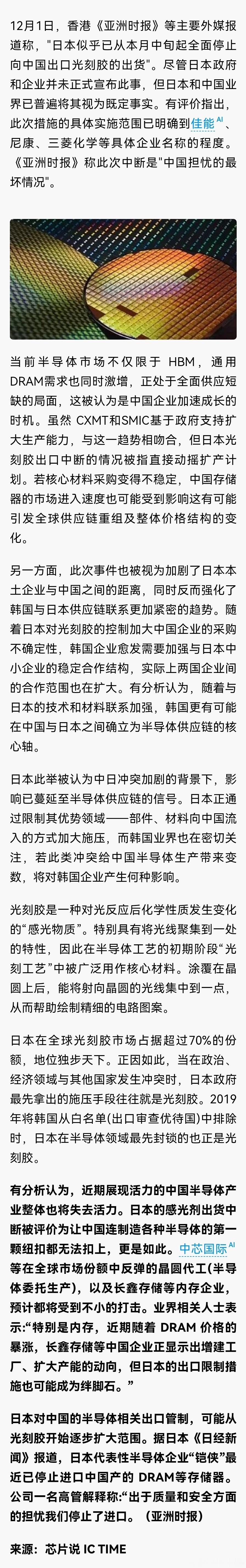【网传日本断供光刻胶,被评价为让中国连制造各种半导体的第一颗纽扣都无法扣上】这事不知道是否最终推行,要是真正实施,我估计短期对我们半导体产业还是影响很大。国产光刻胶得加快发展推进了。 12月1日,香港《亚洲时报》等主要外媒报道称,"日本似乎已从本月中旬起全面停止向中国出口光刻胶的出货"。尽管日本政府和企业并未正式宣布此事,但日本和中国业界已普遍将其视为既定事实。 有评价指出,此次措施的具体实施范围已明确到佳能、尼康、三菱化学等具体企业名称的程度。《亚洲时报》称此次中断是"中国担忧的最坏情况"。 另一方面,此次事件也被视为加剧了日本本土企业与中国之间的距离,同时反而强化了韩国与日本供应链联系更加紧密的趋势。 日本此举被认为中日冲突加剧的背景下,影响已蔓延至半导体供应链的信号。日本正通过限制其优势领域——部件、材料向中国流入的方式加大施压。 日本在全球光刻胶市场占据超过70%的份额,地位独步天下。正因如此,当在政治、经济领域与其他国家发生冲突时,日本政府最先拿出的施压手段往往就是光刻胶。 有分析认为,近期展现活力的中国半导体产业整体也将失去活力。日本的感光剂出货中断被评价为让中国连制造各种半导体的第一颗纽扣都无法扣上,更是如此。中芯国际等在全球市场份额中反弹的晶圆代工(半导体委托生产),以及长鑫存储等内存企业,预计都将受到不小的打击。业界相关人士表示:“特别是内存,近期随着 DRAM 价格的暴涨,长鑫存储等中国企业正显示出增建工厂、扩大产能的动向,但日本的出口限制措施也可能成为绊脚石。”日本对中国的半导体相关出口管制,可能从光刻胶开始逐步扩大范围。据日本《日经新闻》报道,日本代表性半导体企业“铠侠”最近已停止进口中国产的 DRAM等存储器。公司一名高管解释称:“出于质量和安全方面的担忧我们停止了进口。