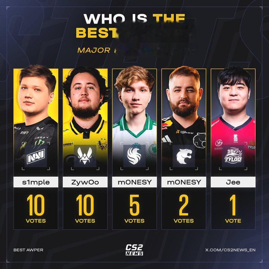 选手票选AWPer之王:s1mple、ZywOo并列,Jee获“真爱一票”