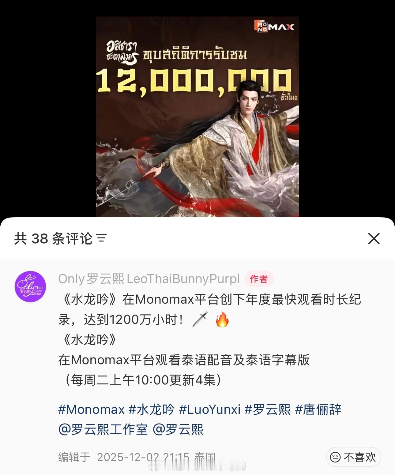 罗云熙水龙吟海外又破一个记录🔥水龙吟在Monomax 平台创下年度最快观看时长纪录,达到1200万小时!🔥他泰实爆🔥