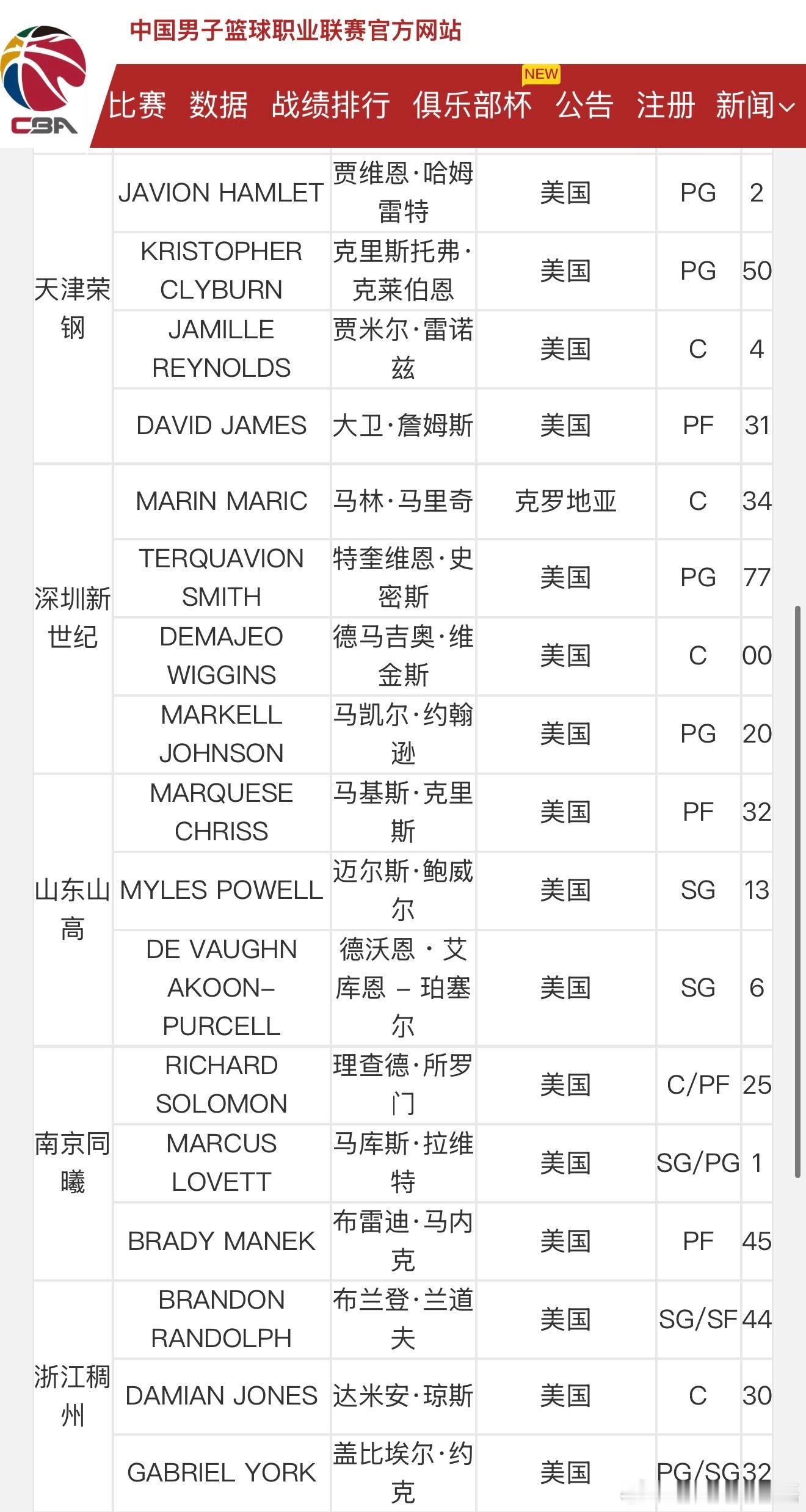 CBA俱乐部杯明日就将开打,我们一起来看看最新的外援注册情况,虽然很多国手可能因为世预赛窗口期不会出战俱乐部杯的比赛,但对于各支球队来说这绝对是外援“验货”的好机会。