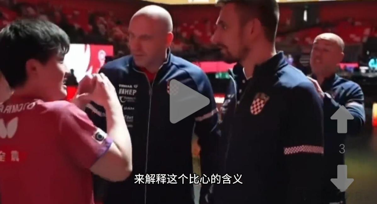 在2025年12月2日成都混合团体世界杯的比赛中,张本智和以2:1逆转战胜克罗地亚选手普卡(三局比分:11-13、11-2、11-8)。获胜后,他兴奋地将双手拇指交叉拼成心形,多次向现场观众席"花式比心"致谢。这一举动迅速引发克罗地亚教练组的兴趣,对方主动上前握手并模仿手势询问含义。张本智和立即开启"解说模式",耐心拆解动作并解释手势象征"爱心"与友好的寓意,现场形成轻松有趣的跨文化互动场景。