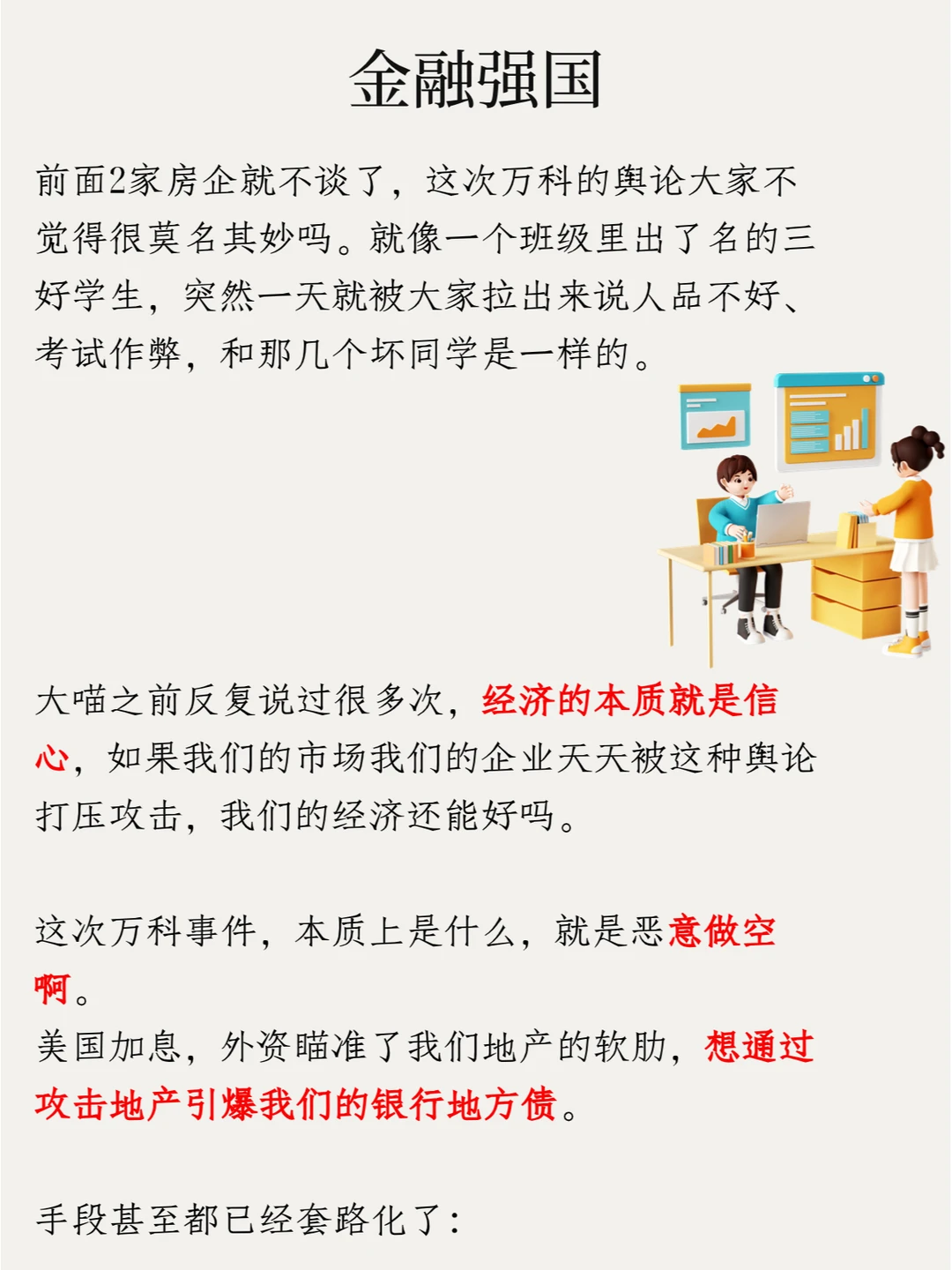 这次万科事件,本质上是什么,就是恶意做空啊。美国加息,外资瞄准了我们地产的软肋,想通过攻击地产引爆我们的银行地方债。