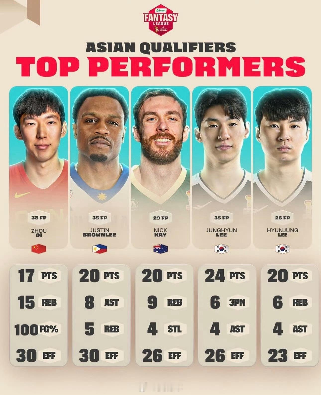 虽然但是,周琦还是凭借着30的效率值进入男篮世预赛第一窗口期第二轮的最佳五人阵容