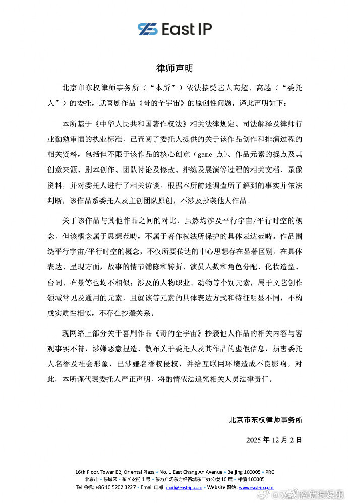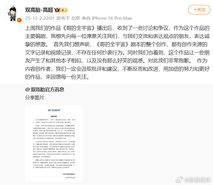 双高胎回应哥的全宇宙被指抄袭双高胎称不存在任何抄袭行为 回应《哥的全宇宙》被指抄袭,称剧本的整个创作,都有创作来源的文字记录和视频记录,“不存在任何抄袭行为”,并转发律师声明,将酌情依法追究相关人员法律责任。