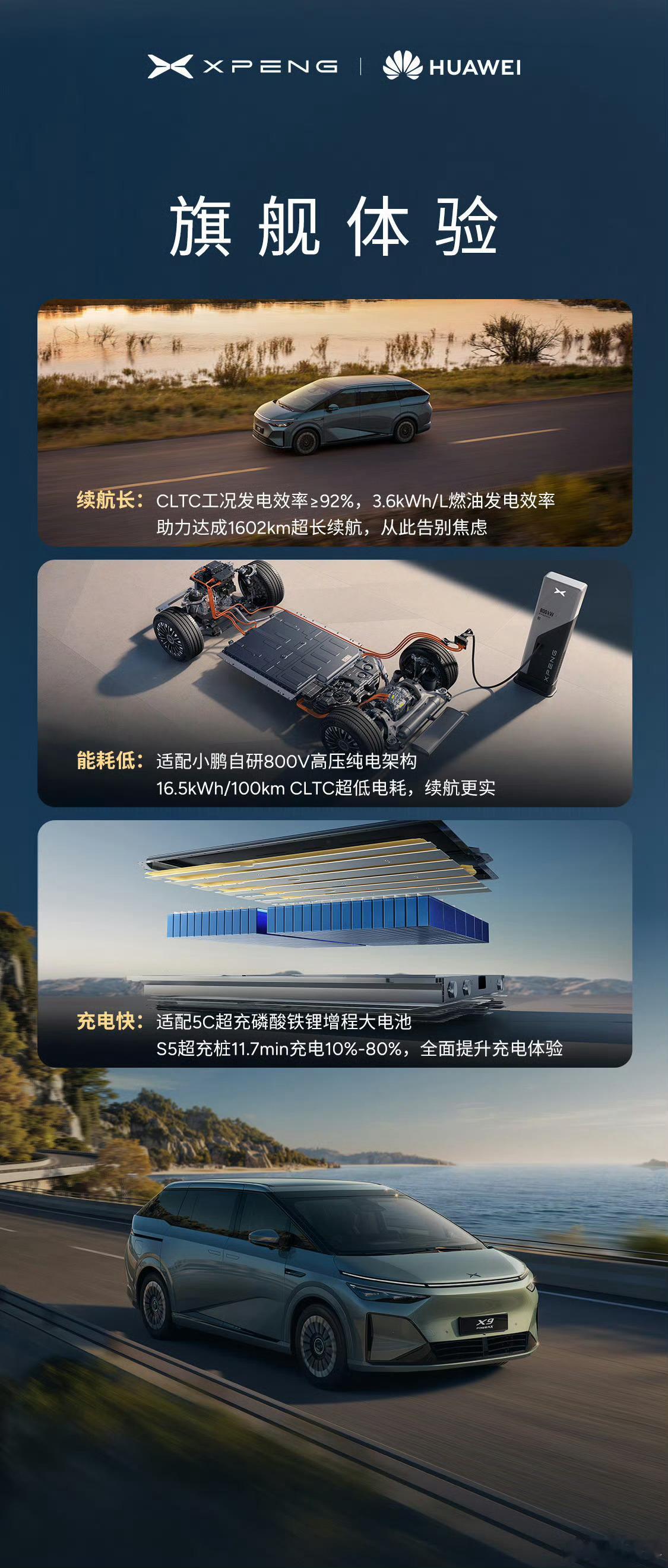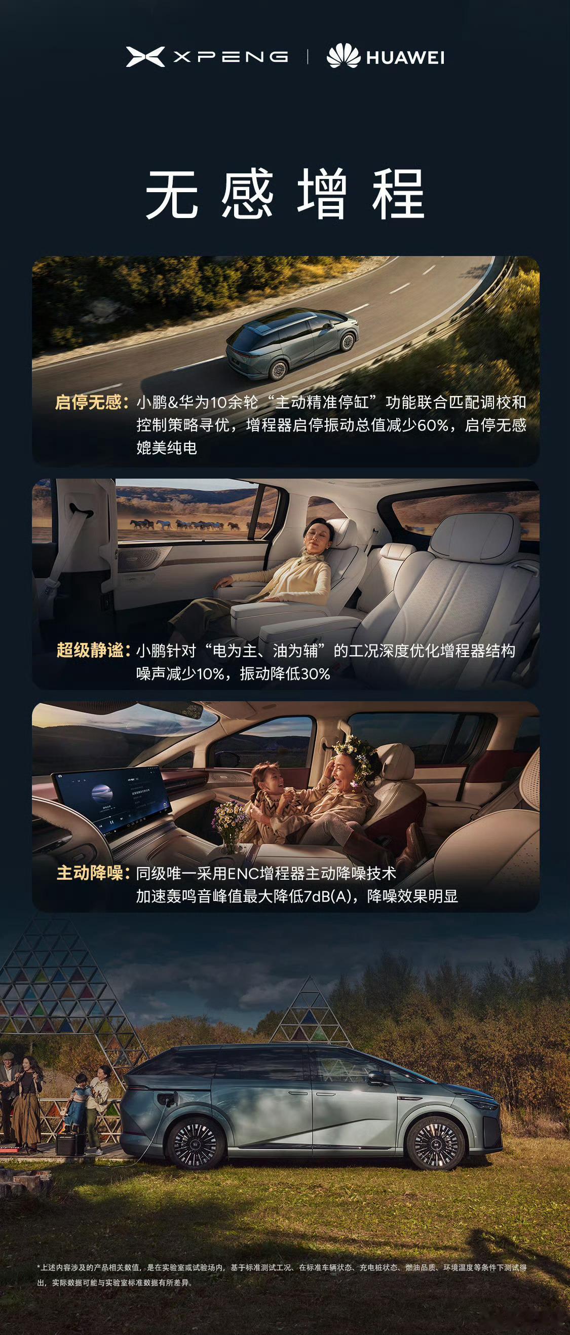 强强联合, 搭载华为 DriveONE 下一代增程发电机!适配 800V 高压平台,实现无感启停与超级静谧,CLTC 续航高达 1602km,充电十分钟即享 313km 续航小鹏与华为联合打造,这是面向下一代的增程。