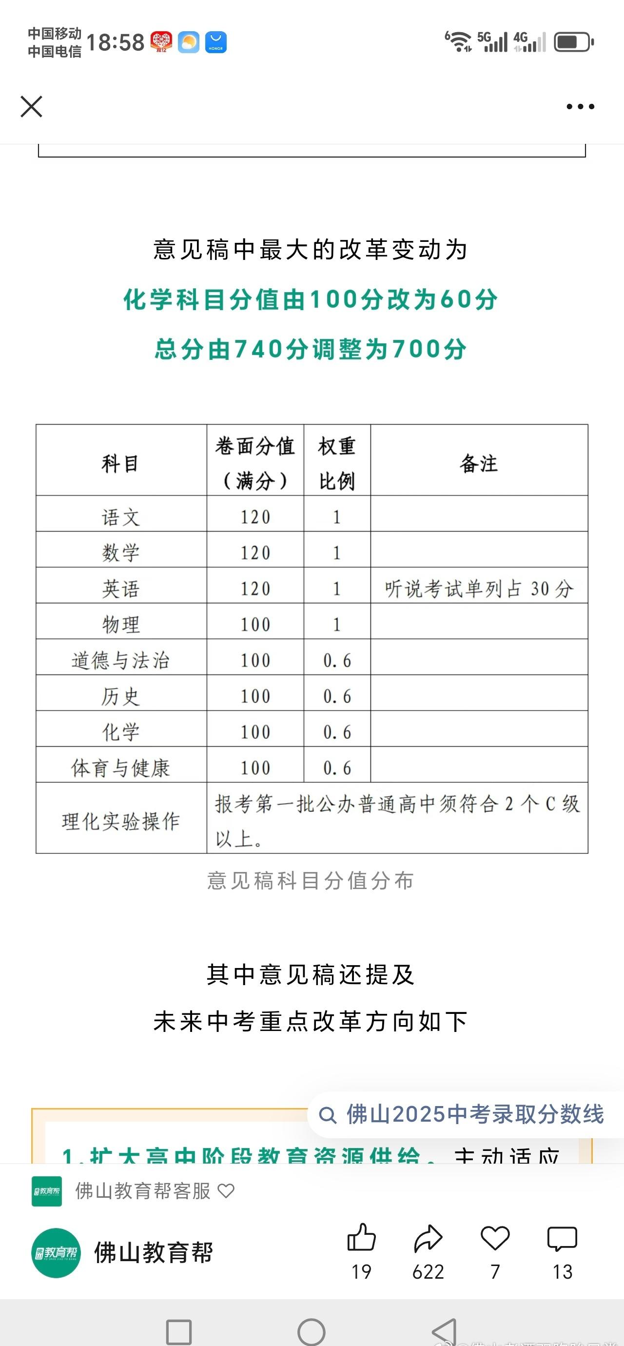 佛山中考拟化学科降分为60。