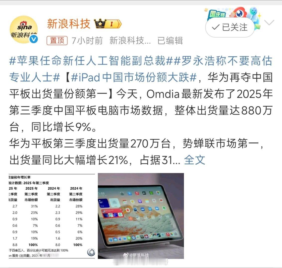 iPad中国市场份额大跌从数据上看,变化挺明显的。华为平板出货量270万台,涨了21%,稳坐第一。苹果iPad出货量200万台,跌了14%。小米和联想也都在增长。这说明,华为的性价比和生态策略确实奏效了,而苹果的市场份额正在被国产品牌分走。现在消费者更看重实际功能和性价比,如果苹果在创新和定价上没大动作,这种趋势可能会继续。