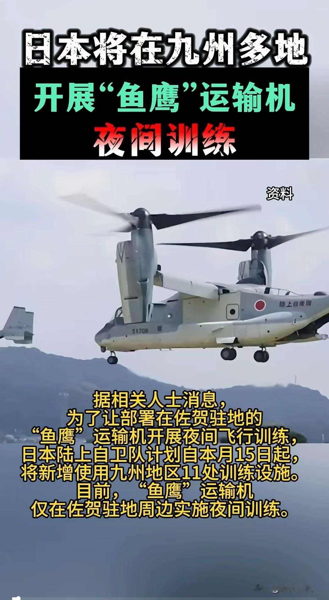 日本放大招!九州新增11处“鱼鹰”夜间训练场,离民居超近,民众慌了? 12月2日消息,据日本陆上自卫队宣布,计划于12月15日起在九州地区新增11处训练设施,专门用于开展“鱼鹰”运输机夜间飞行训练。这些新增场地包括福冈县芦屋基地、筑城基地,佐贺县目达原驻地,长崎县相浦驻地等关键区域 。“鱼鹰”运输机被普遍认为是针对潜在战争场景的核心装备,日本自卫队近年来军事活动持续升级,此次扩大夜间训练范围的举动,不仅引发当地民众强烈不满,更让周边国家感到紧张不安,迅速成为外界热议焦点。 民众遭噪音与安全双重困扰,抗议声浪再起 九州新增的11处“鱼鹰”夜间训练场,多个选址紧邻居民区,这让当地民众陷入深深担忧。这款倾斜旋翼式军用运输机的起降噪音峰值可达110分贝,堪比电锯轰鸣,夜间飞行时的持续噪音更是远超环保标准。此前东京厚木基地周边居民长期受“鱼鹰”噪音困扰,相关调查显示该区域儿童多动症发病率比其他地区高出20%,且听力障碍患者比例显著上升。 更让民众揪心的是“鱼鹰”糟糕的安全记录:今年驻日美军“鱼鹰”在冲绳海域坠海断为数截,此前还发生过冲绳迫降、鹿儿岛坠毁等多起事故 。事实上,自日本政府2014年公布“鱼鹰”部署计划以来,佐贺县民众已连续多年抗议,曾有百余名民众在37℃高温下高举“停止部署‘鱼鹰’”标语集会,部分民众情绪激动落泪。如今训练场直接逼近民居,安全隐患与噪音污染的双重压力,让新一轮抗议声浪正在九州各地蔓延。 军事动作引地区警惕,东亚局势添变数 从地区安全视角来看,此次扩大训练并非孤立事件。“鱼鹰”作为具有短距起飞和垂直降落能力的军用运输机,广泛应用于各类军事行动,更是日本西南离岛防卫的核心装备,其作战半径可覆盖多个敏感区域。日本陆上自卫队直言,训练目的是提升部队实战能力,但结合其近年频繁与驻日美军开展协同演习、持续增加防务预算的动作,不难看出其军事扩张的明显苗头 。 值得注意的是,此前“鱼鹰”夜间训练仅局限于佐贺驻地周边,且多选址远离市区的区域以减少民扰 。此次打破惯例将训练场向居民区延伸,既暴露了其军事训练常态化的野心,也凸显了对民众诉求的漠视。在当前东亚地区局势敏感的背景下,这种加码军事部署的行为,无疑会打破地区军事平衡,引发周边国家的高度警惕,让本就复杂的地区安全局势更趋紧张。 正常的军事训练固然是主权国家的权利,但日本在敏感时刻扩大“鱼鹰”夜间训练范围,且忽视民众安全与生活权益,显然是不负责任的举动。如何在维护自身安全与兼顾地区稳定、民众利益之间找到平衡,是日本政府需要正视的课题。若处理不当,不仅会加剧国内民怨,更可能给地区和平稳定带来不可预知的风险。 (文章来源:北国网 综合央视新闻、新华社等) 你觉得日本新增“鱼鹰”训练场会带来哪些影响?是单纯的军事能力提升,还是地区紧张局势的催化剂?欢迎在评论区留言讨论~
