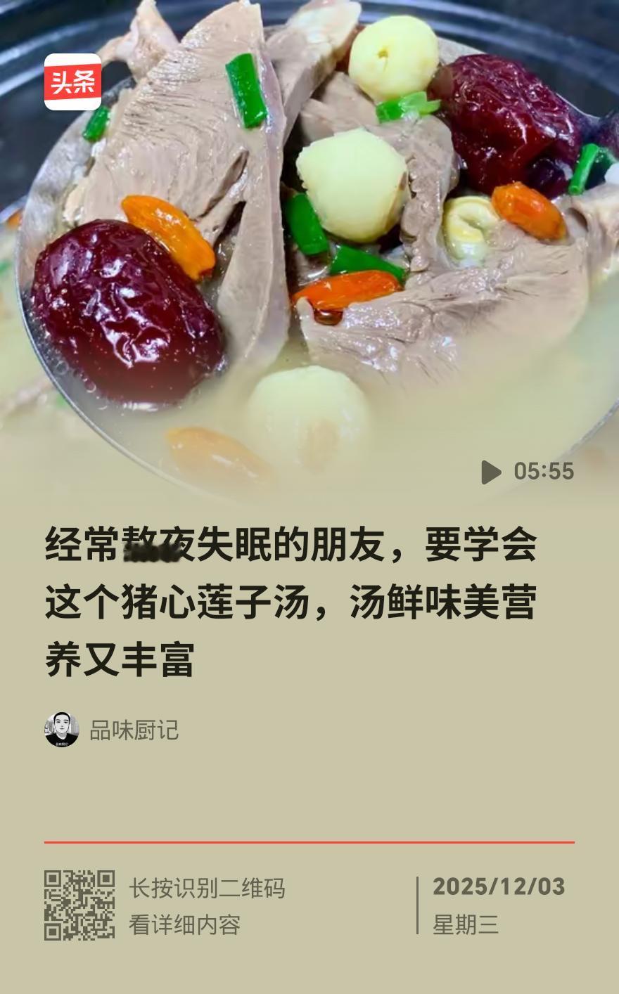 中老年人必看!猪心2种家常做法,护心助眠超实用 猪身上藏着护心“宝贝”——猪心!富含蛋白质、维生素B族和辅酶Q10,中医说它能养心安神,现代营养也证实对心脏好、助睡眠,中老年人每周吃一次正合适,做法简单还下饭。 买猪心要选鲜红有弹性、没异味的,处理时对半剖开,把血块和白筋膜抠干净,反复抓洗去腥。爱吃辣的试试香菜炒猪心:猪心斜切片,用料酒、生抽、淀粉腌15分钟,大蒜切末、辣椒剪段,热锅多放油,爆香姜片蒜末和辣椒,倒入猪心大火快炒2-3分钟,加盐糖提鲜,撒香菜段就出锅,脆嫩香辣超下饭。 偏爱清淡的做白萝卜猪心汤:猪心切块冷水下锅,加姜和料酒焯去浮沫,和萝卜块、去核红枣、姜片一起下锅,加足量清水大火烧开转小火炖40分钟,放枸杞再炖5-10分钟,加盐调味即可。汤水清甜,猪心软嫩,暖身又安神。 提醒大家,猪心别过量吃,每周一次刚好。处理干净、烹饪熟透,才能吃得放心。中老年人赶紧试试这两道家常做法,用普通食材守护健康,睡得香、心脏稳! 需要我把这篇快讯调整成更适合短视频口播的版本,突出关键步骤和亮点吗?养身猪心汤 莲子猪心汤 安神白莲猪心汤