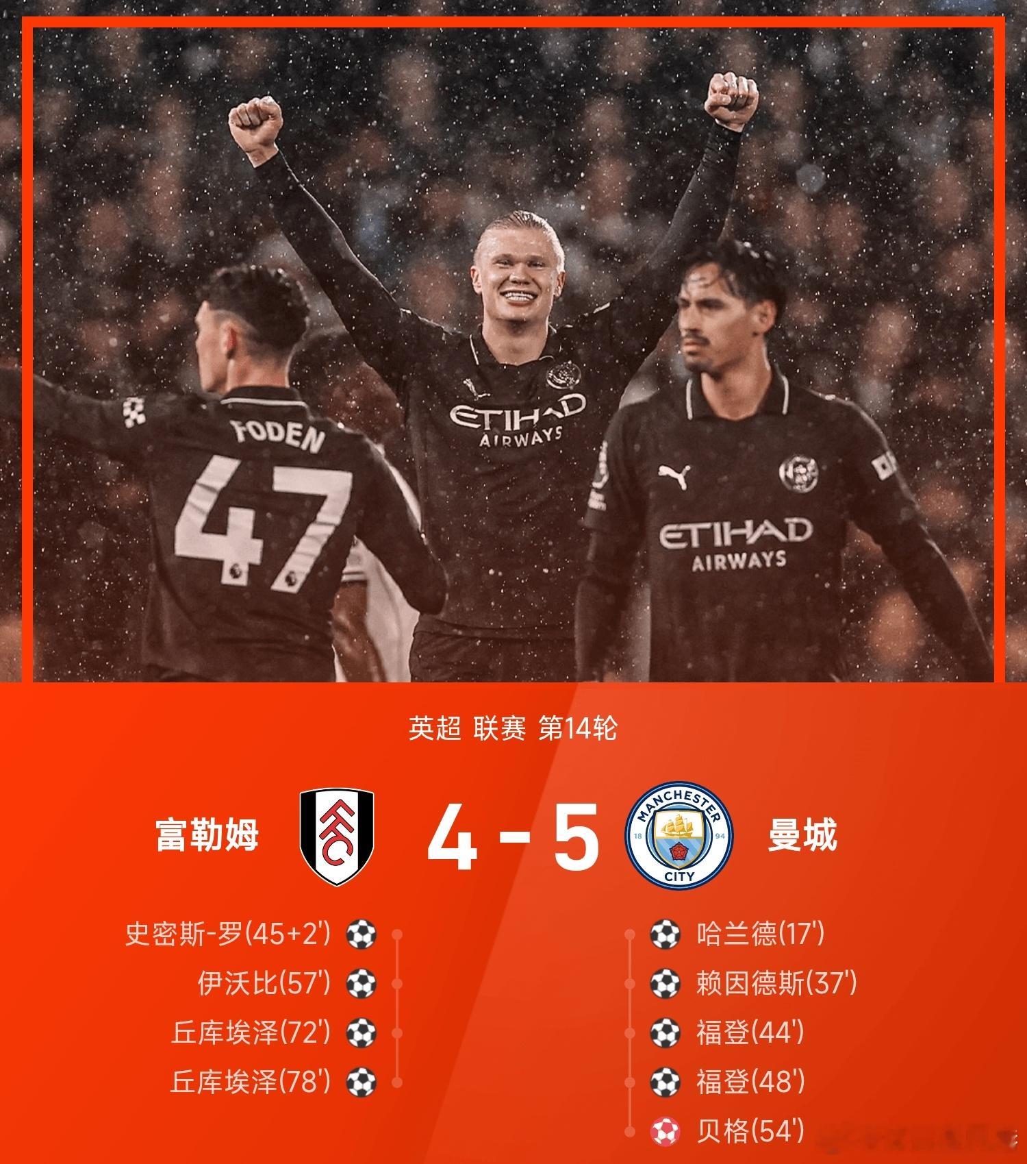 富勒姆4比5曼城 富勒姆对阵曼城。第17分钟,多库传中,哈兰德推射破门,曼城率先打破僵局。第37分钟,哈兰德助攻赖因德斯单刀挑射破门。第44分钟,福登禁区外世界波破门。上半场补时第2分钟,威尔逊助攻史密斯-罗头球得手,半场曼城3-1领先富勒姆。第48分钟和第54分钟,福登抢点破门、贝格不慎自摆乌龙,曼城将比分扩大到5-1。随后比赛进入富勒姆时间,第57分钟,伊沃比禁区外精准推杆直窜球门右下角。第72分钟,丘库埃泽爆杆抽射打进远角,VAR确认进球有效。第78分钟,丘库埃泽爆杆抽射再扳一球。最终曼城在客场5-4险胜富勒姆。