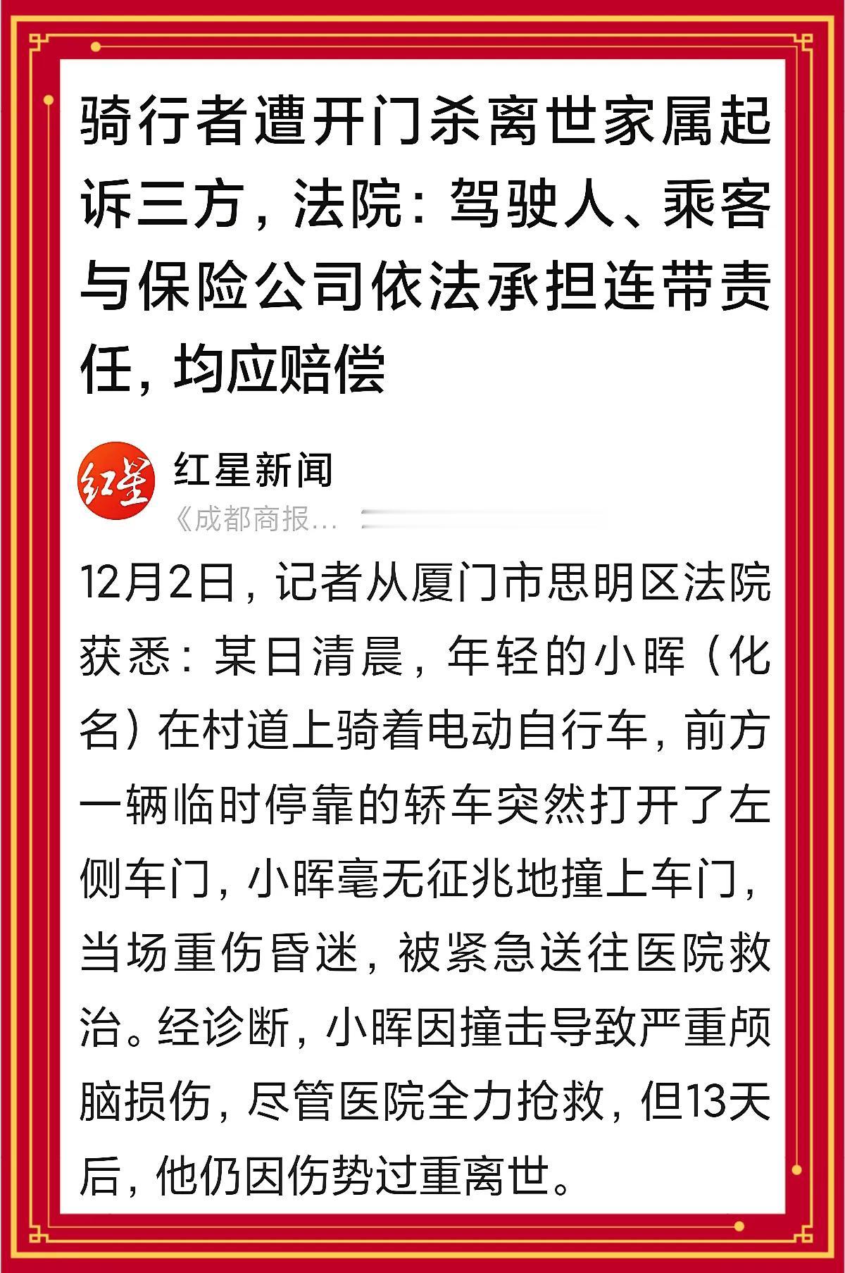 清晨骑行遇“开门杀”,年轻生命遗憾离世。厦门思明法院判定:轿车驾驶人、乘车人及保险公司需承担连带责任,共同赔偿。这起悲剧再次敲响警钟:停车开门多留意,莫让疏忽酿惨剧。 “开门杀”需要完善现有法律,比如提高“开门杀”的民事赔偿标准、细化交通违法处罚条款,同时加强“荷式开门法”等安全知识的普及。 [微风]荷式开门法·安全提示卡[微风] 核心原则:先观察,再开门,慢动作 1.换手开门 驾驶位伸右手,副驾伸左手,借动作带动身体转向车后。 2.双重观察 先看车内后视镜,再扭头查车门后方盲区,确保无行人、车辆。 3.缓开车门 先开一条小缝二次确认,无风险再完全打开。 (图片来自网络)