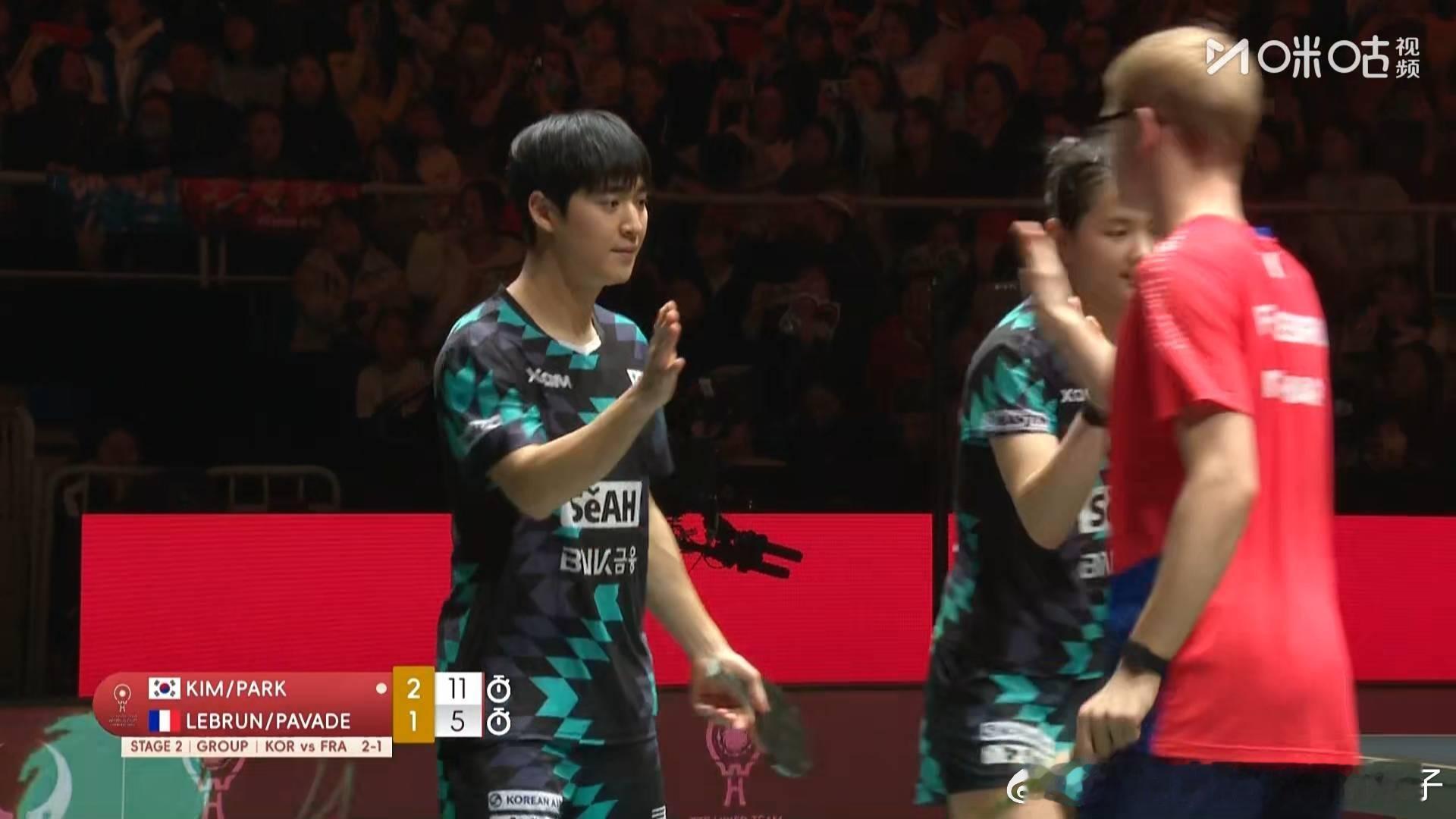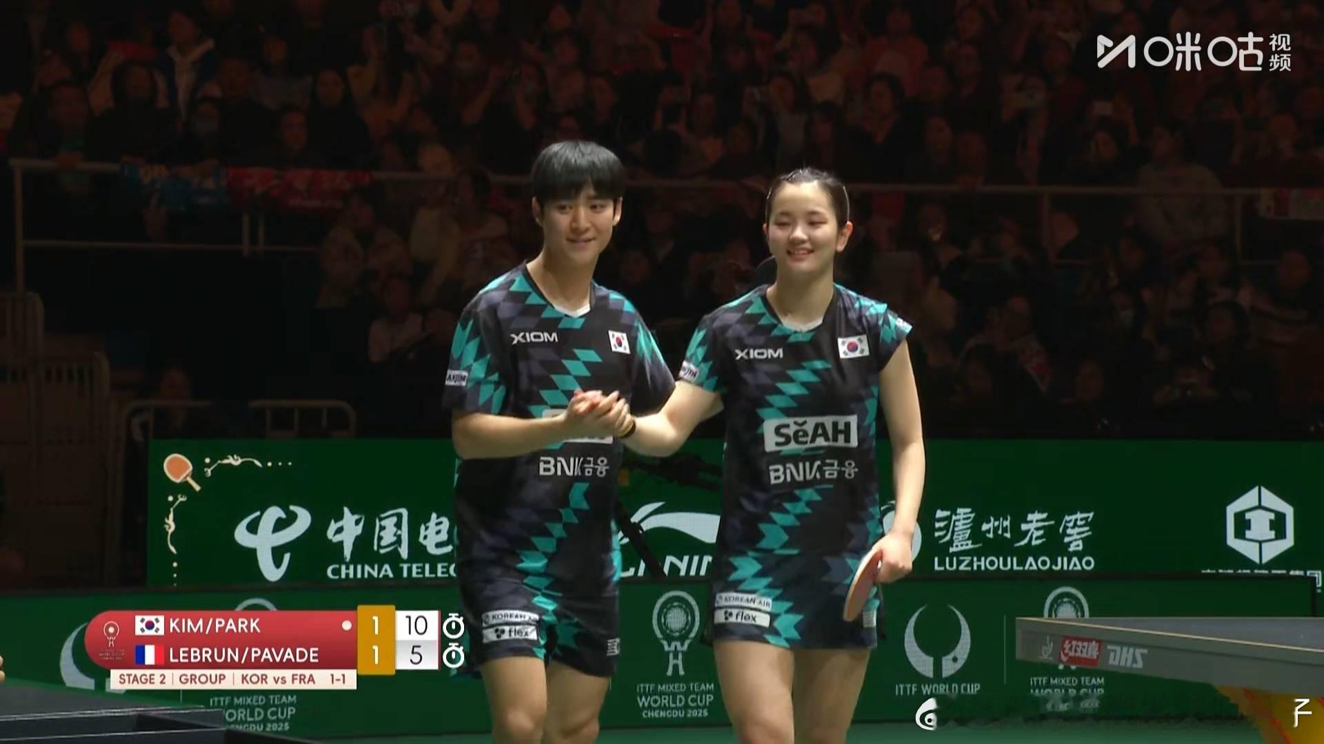 朴康贤金娜英2比1菲利克斯勒布伦帕瓦德(-12,5,5)第二盘:李恩慧VS袁嘉楠韩国队二比一法国队2025年国际乒联成都混合团体世界杯第二阶段
