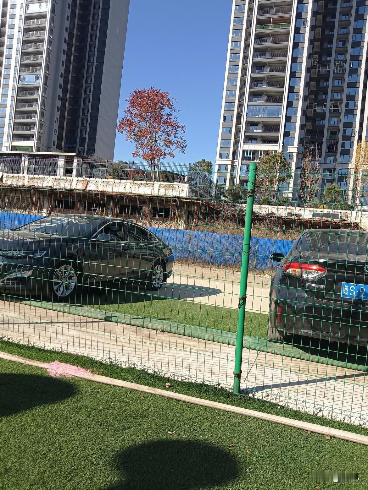今天下楼遛弯,一抬头瞧见楼中间那棵树,叶子红得正热闹,衬着透亮的蓝天,怪好看的。 就是眼前这绿铁网有点扎眼,网那边停着两辆车,旁边像是没完工的工地,墙皮都掉了些。 不过天气是真舒服,晒得人暖乎乎的,连假草坪都看着软和。 住高楼里久了,总盼着能多瞅点鲜活的颜色——比如这棵突然红透的树,像给灰扑扑的楼群塞了颗糖,哪怕隔着铁网,也能捞着点秋天的甜。