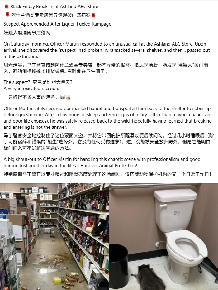 小浣熊偷喝商店烈酒后醉倒在卫生间当地时间12月2日,美国弗吉尼亚一家酒品商店卫生间里躺着位不省人事的“特殊顾客”,一只偷喝了多种烈酒的浣熊!据当地动物保护收容所描述,这毛茸茸的“劫匪”扫荡货架后醉倒在厕所,工作人员将它带到收容所醒酒,待其清醒后已放归自然。官方调侃:“希望它明白破门而入不是解决问题的办法~”