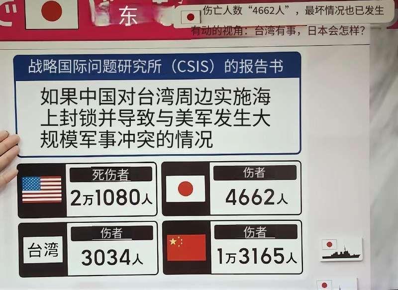 难怪本子敢叫嚣护台!下图是日本的战略国际问题研究所(CSIS)对“台湾有事,日本会怎样?”这个议题所做的一份最新兵推报告。 报告认为,如果大陆对台湾周边实施海上封锁,并因此导致与美军发生大规模军事冲突的情况,那么结果是:美军伤亡21080人,解放军伤亡13165人,台湾伤亡3034人,而日本最坏的情况是伤亡4662人。 话说本子你家研究所莫不是把现代战争当电子游戏策划了?你家仅仅伤亡这点人数?敢情大漂亮和我们给你和弯弯当冤大头了,中美两家对掏,就你本子和弯弯是大聪明,躲到边边纳凉去啦? 我建议下次兵推,你直接上科幻剧本:奥特曼领衔,哥斯拉手撕军舰,自卫队变身高达参战,伤亡归零!这样多好,又可以在梦里自嗨了!