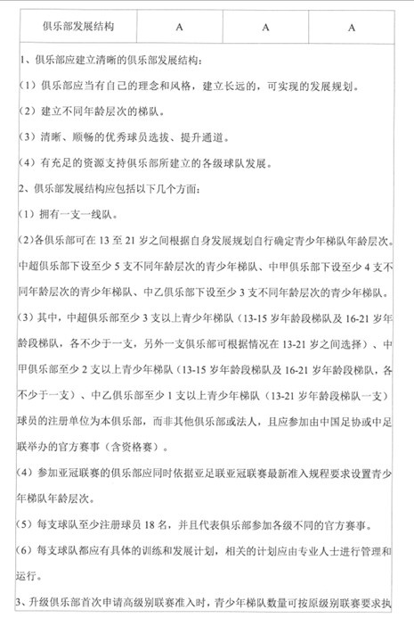 (2)各俱乐部可在13至21岁之间根据自身发展规划自行确定青少年梯队年龄层次。中超俱乐部下设至少5支不同年龄层次的青少年梯队。中甲俱乐部下设至少4支不同年龄层次的青少年梯队。中乙俱乐部下设至少3支不同年龄层次的青少年梯队。
