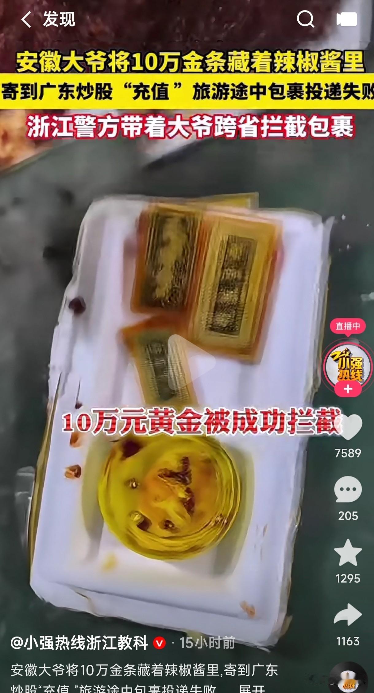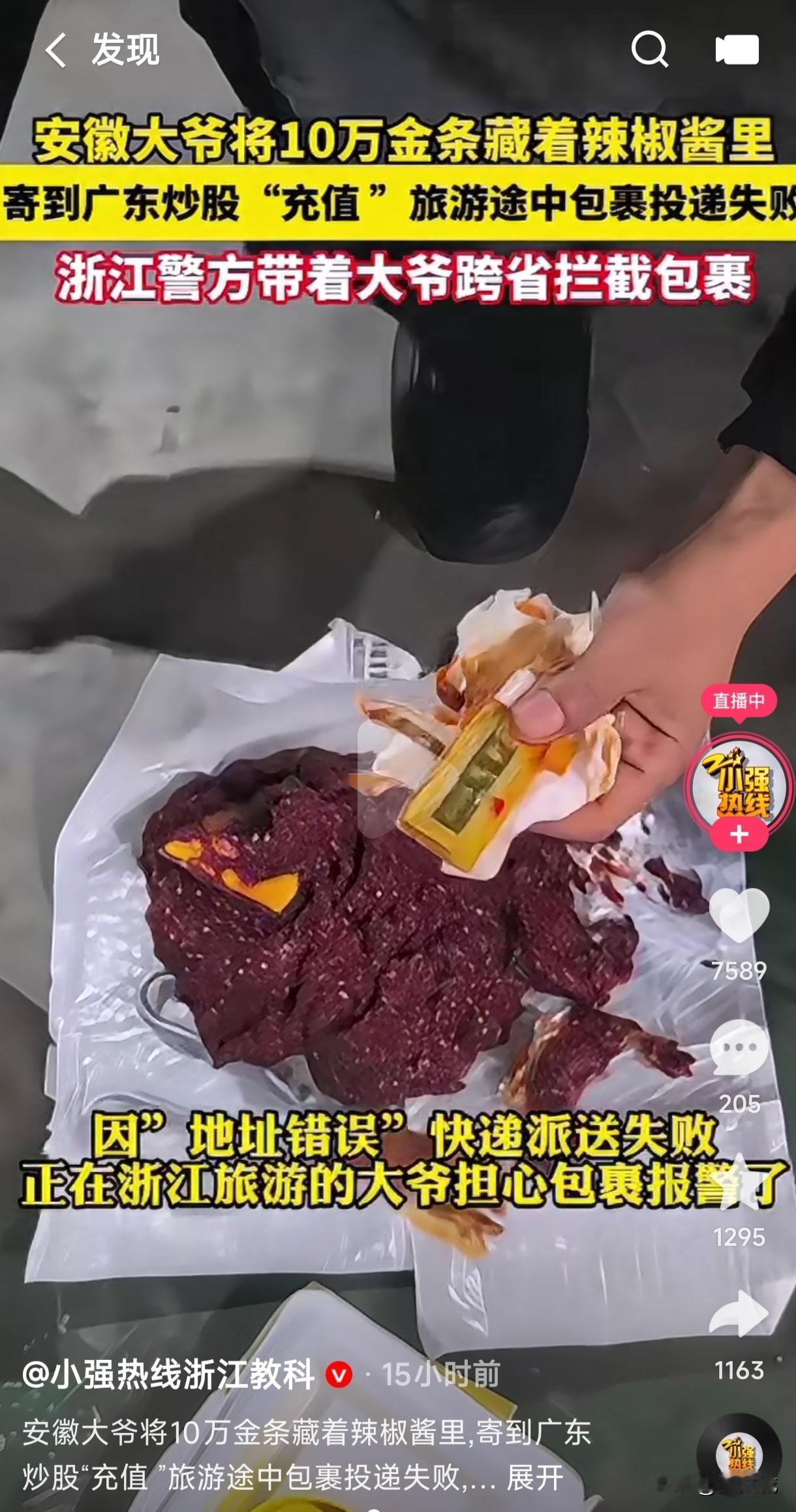 安徽大爷将10万金条藏辣椒酱里,寄到广东炒股充值,因地址错误派送失败,正在浙江旅