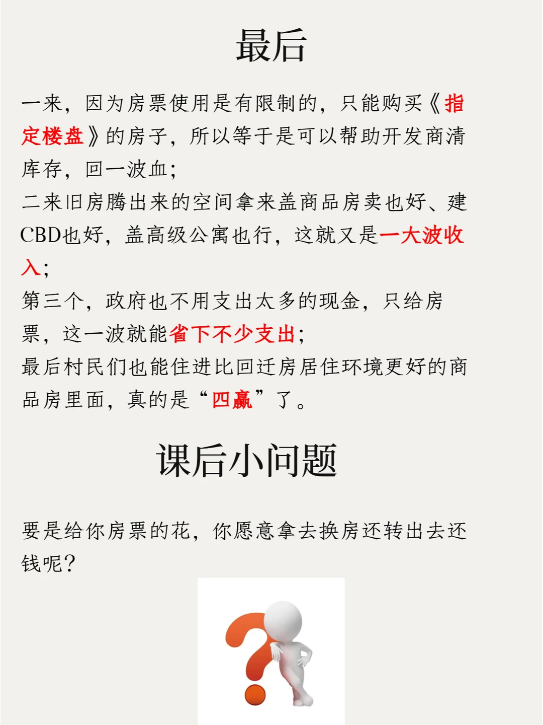 一来,因为房票使用是有限制的,只能购买《指定楼盘》的房子,所以等于是可以帮助开发商清库存,回一波血;二来旧房腾出来的空间拿来盖商品房卖也好、建CBD也好,盖高级公寓也行,这就又是一大波收入;而且政府也不用支出太多的现金,只给房票,这一波省了不少支出;然后村民们也能住进比回迁房居住环境更好的商品房里面,真是“四赢”。