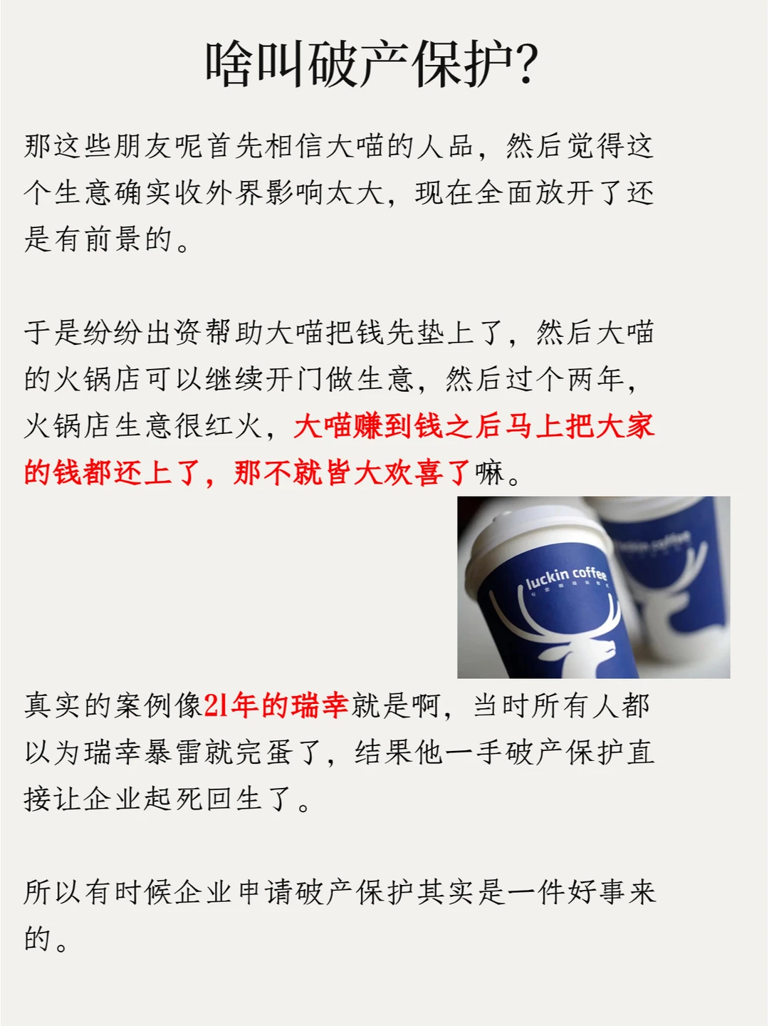 真实的案例像21年的瑞幸就是啊,当时所有人都以为瑞幸暴雷就完蛋了,结果他一手破产保护直接让企业起死回生了。