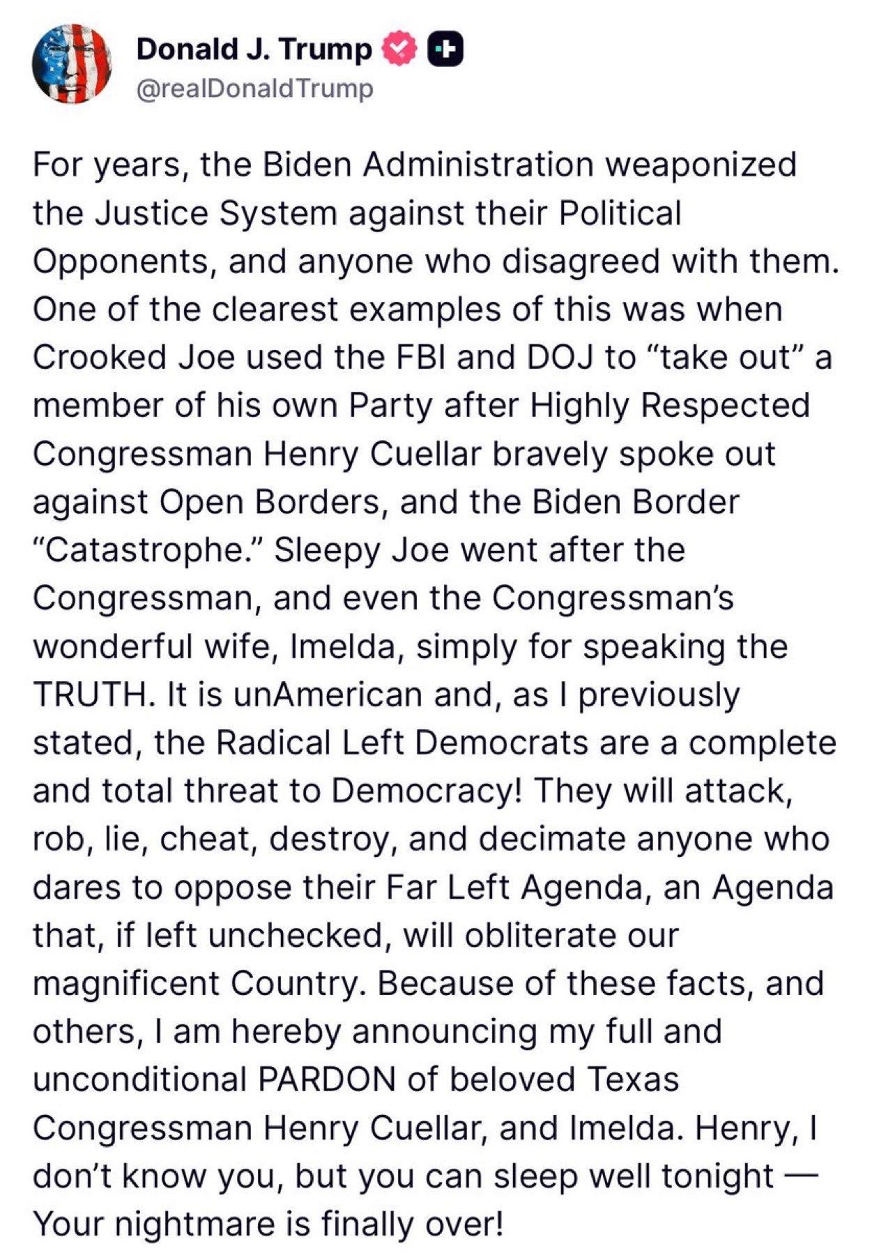 特朗普总统宣布,他将全面赦免得克萨斯州民主党众议员亨利·奎利亚尔Henry Cuellar 及其妻子,他们于2024年因包括联邦贿赂、洗钱和共谋指控罪名被起诉。