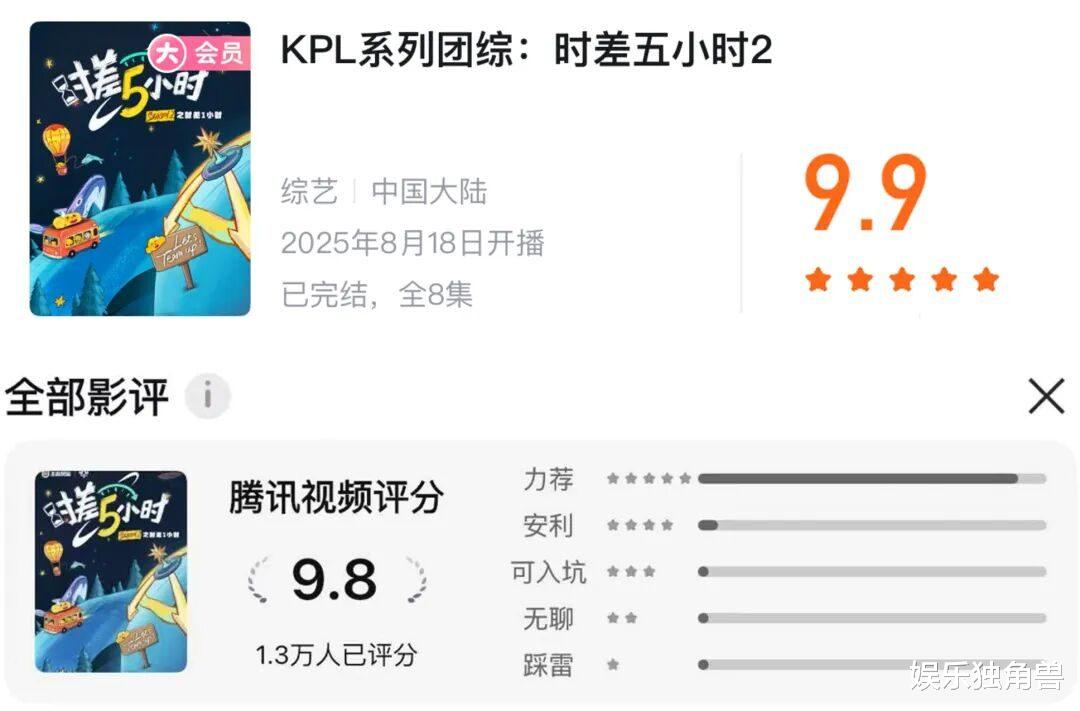 今年的KPL团综《时差五小时2》稳定发挥,8集正片播放量高达1.5亿,收获9.2亿话题曝光,热搜数量突破第一季纪录,全网热点339个,正榜热搜较第一季提升103%;迄今在腾讯视频站内评分9.8分。在哔哩哔哩的视频播放量超1200万次,评分9.9分。