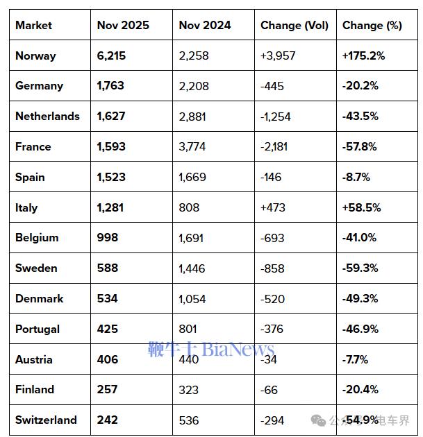 据electrek报道,特斯拉2025年11月欧洲市场注册量已陆续公布,数据呈现出一幅严峻图景:几乎所有主要市场的需求仍在持续崩塌,唯有一个例外——它几乎独自撑起了整个欧洲的销量。