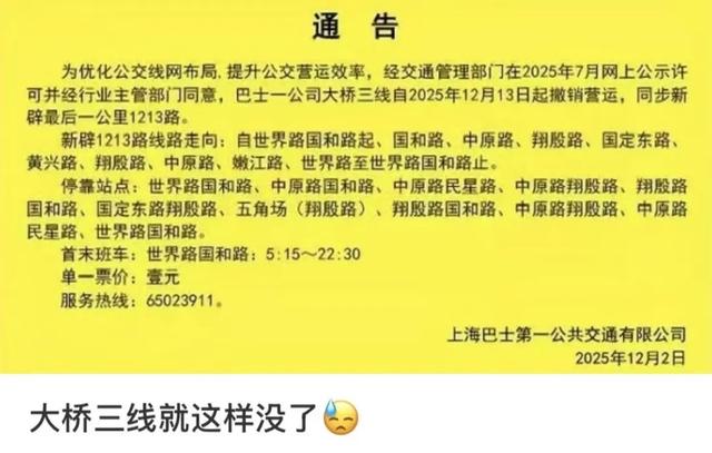 虽然大桥三线要下线了,但官方同步新辟的1213路会接过“最后一公里”的接力棒——从世界路国和路出发,绕中原路,翔殷路,黄兴路跑圈,1元票价,5:15到22:30的运营时间,方便杨浦周边居民出行。