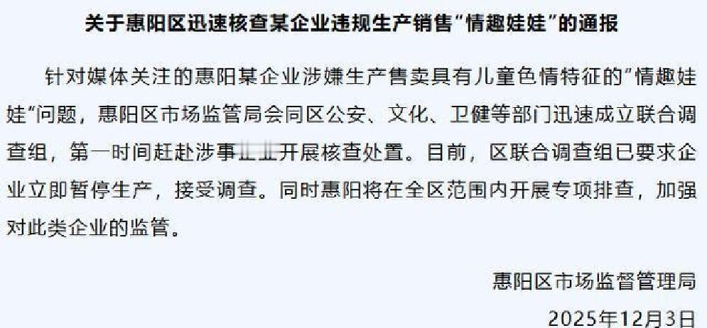 最近网上爆出个让人脊背发凉的事儿:广东惠阳那边,好几家小工厂正大张旗鼓地搞起“儿童风”情趣产品线,这些硅胶玩意儿身高从40厘米拉到170厘米不等,长得跟小女孩儿一模一样,还加了加热和吸力啥的成人把戏,价格就几百块起步,高端的过千。工厂不光做这个,还顺带整“孕妇款”,明码标价,专供某些人“解闷”。 事儿是怎么露馅的?记者一头扎进淘宝、京东、抖音这些平台,敲“幼态人偶”或“萝莉手办”几个词,刷出来的货色压根儿不是给娃娃玩的玩具,而是披着二次元外衣的成人用品。用户留言里头,直白得没法啥“超逼真”“玩着带劲”都冒出来了。顺着发货单追根儿,源头直指惠阳和东莞的作坊,这些地方的灰色链条早织成网,产量不小,销路四通八达。 12月3号这天,惠阳市场监管局坐不住了,赶紧拉上公安、文化、卫健部门组队杀到现场,勒令涉事厂子立马关停生产线,全盘接受审查。整个区里头立马启动拉网式大检查,誓要把这类隐患挖干净。同一时间,东莞企石也亮剑,查封一批货,联合执法正紧锣密鼓推进。根据最新统计,这类违规品在电商平台的曝光率高达15%以上,月销量破万件,产业链涉及上百家供应商,利润空间大得吓人。 这帮人钻了监管空子,把低俗需求包装成“艺术品”,但这哪是生意,分明在腐蚀社会底线,间接助长不健康风气。光靠一锤子调查不够,得建长效机制:平台算法得升级,自动筛掉敏感词;工厂准入门槛拉高,定期突击抽检;更要从源头堵住原料流通。否则,这股歪风一波接一波,孩子们的纯真世界就真危险了。严打势在必行,谁碰谁倒霉,早日斩草除根才对得起良心!