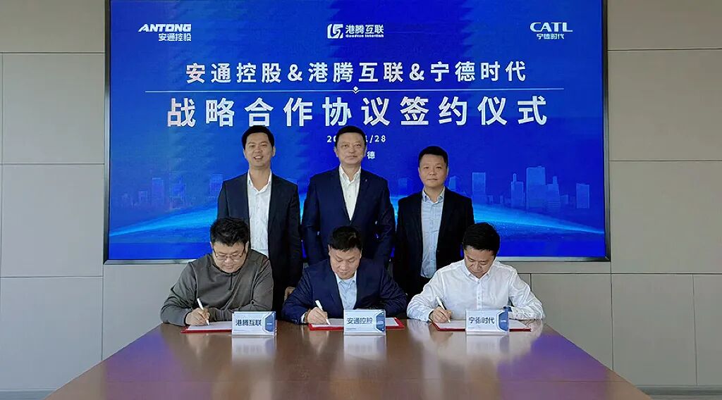 宁德时代重工业务部助理执行副总裁陈佳能、安通控股副总裁兼航运中心总经理郭朝阳、港腾互联市场总监杨诗岑作为代表签署协议。宁德时代重工业务部执行总裁王静竹、安通控股董事总裁楼建强、港腾互联总经理庄伟锋出席并见证签约。